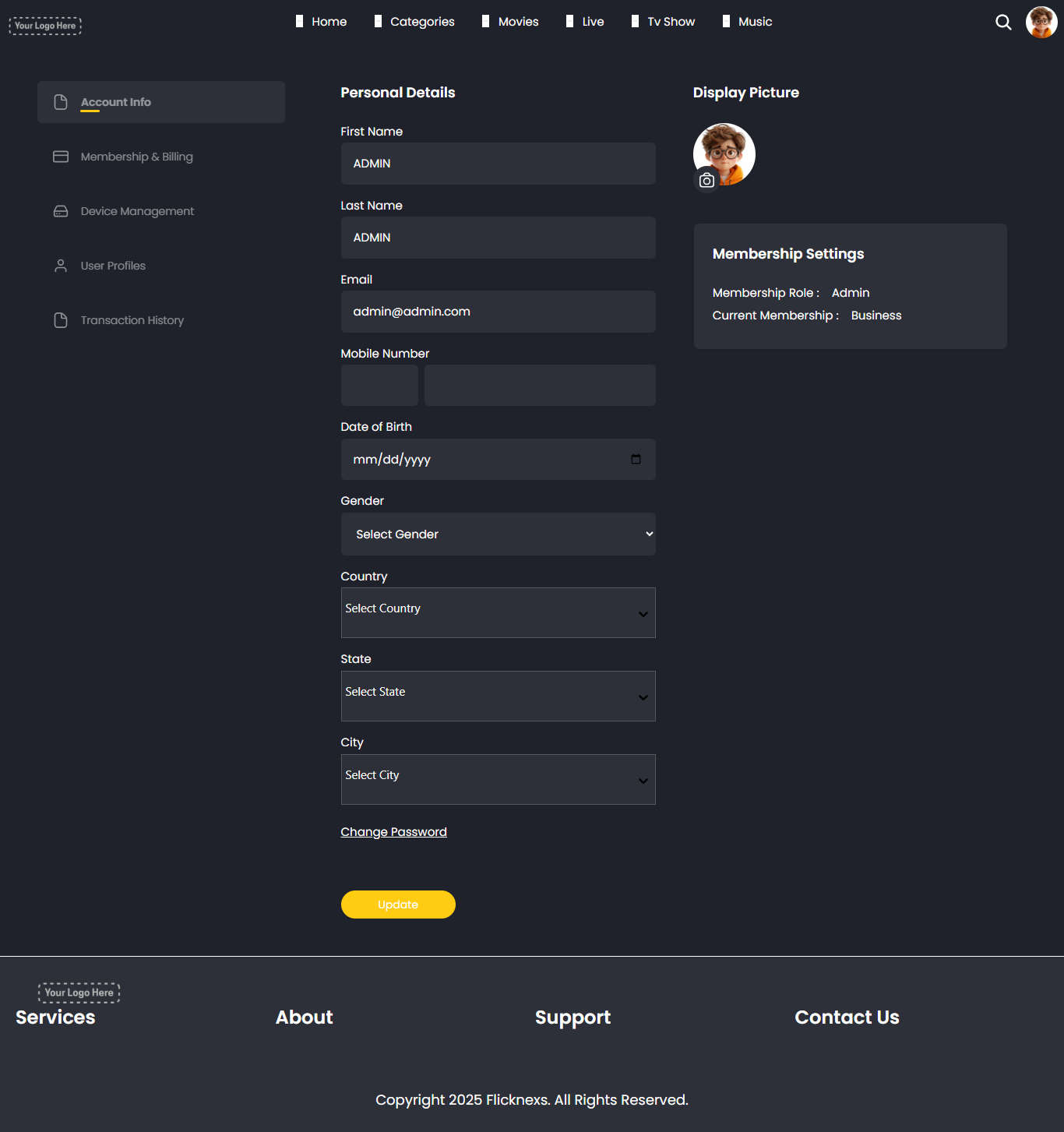 After selecting “My Profile”, you’re directed to the Account Info section. This page allows you to view and edit your account details.