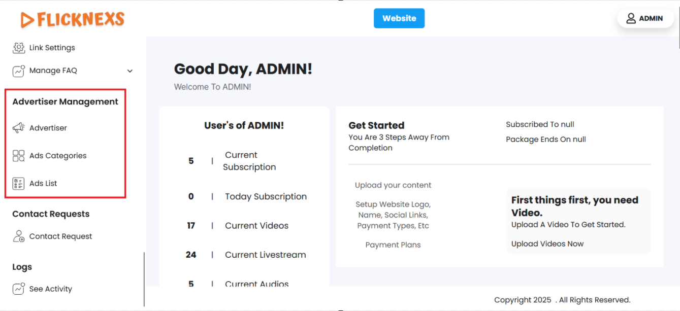 Login to your admin panel and navigate to the ‘Advertiser Management’ in the side menu. You will find four options. Follow these steps to manage ads: