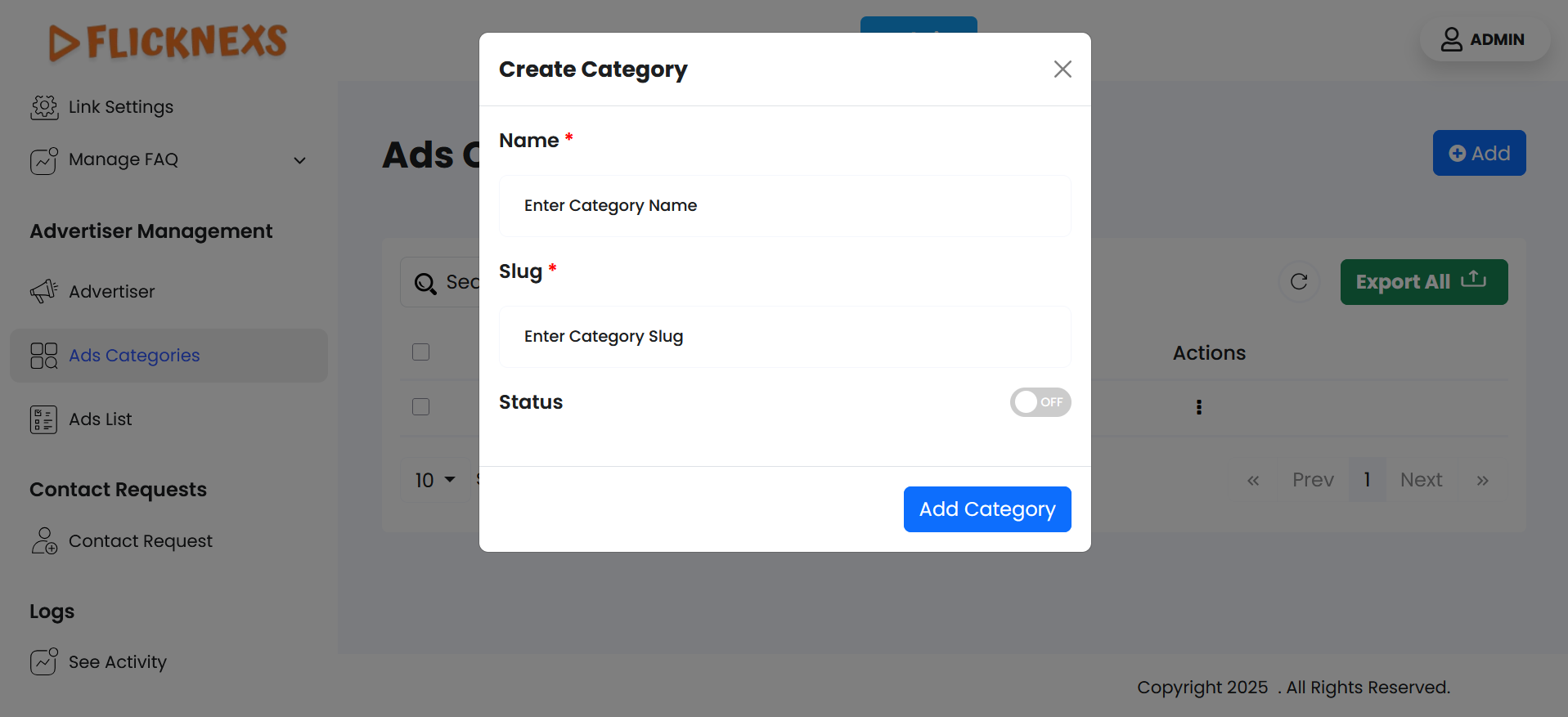 - You will find three boxes in the form modal. The first one is a dynamic field that will synchronously update the name you enter in the ‘Advertisement Name’ textbox. The second and third are named Category and Status Settings.
