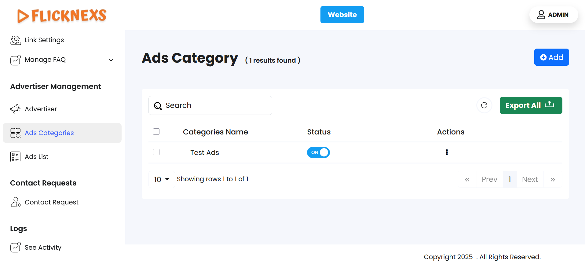 You can view the ads that run on your platform, category-wise, to quickly take action. You will find a table with the following items: