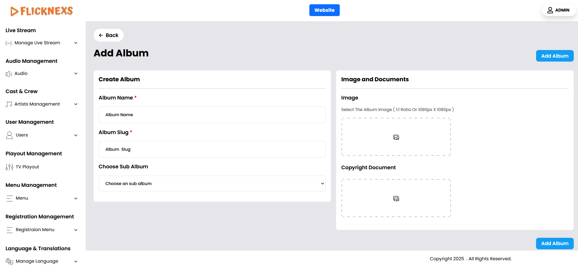- Image: Upload a cover image that represents the album. This image will be displayed alongside the album name on the platform, giving users a visual reference.