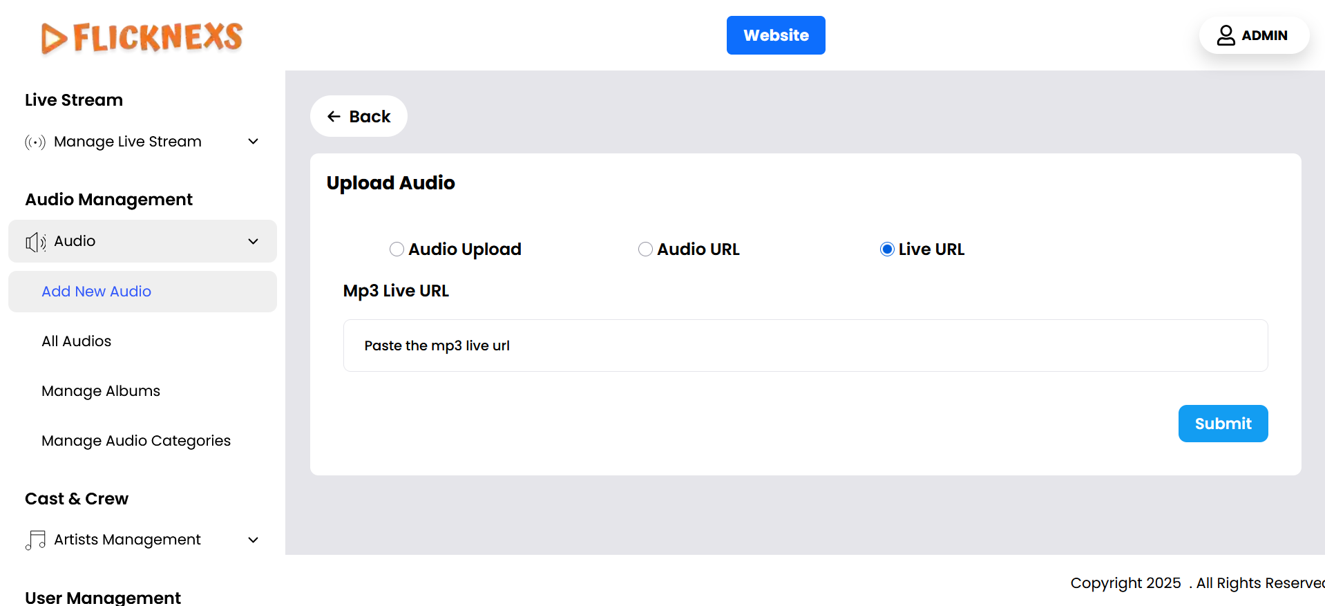 - Use Case: This option is perfect for broadcasting live audio content, such as radio shows, live commentary, or other real-time events, where users need to connect to a live stream rather than uploading a static file.