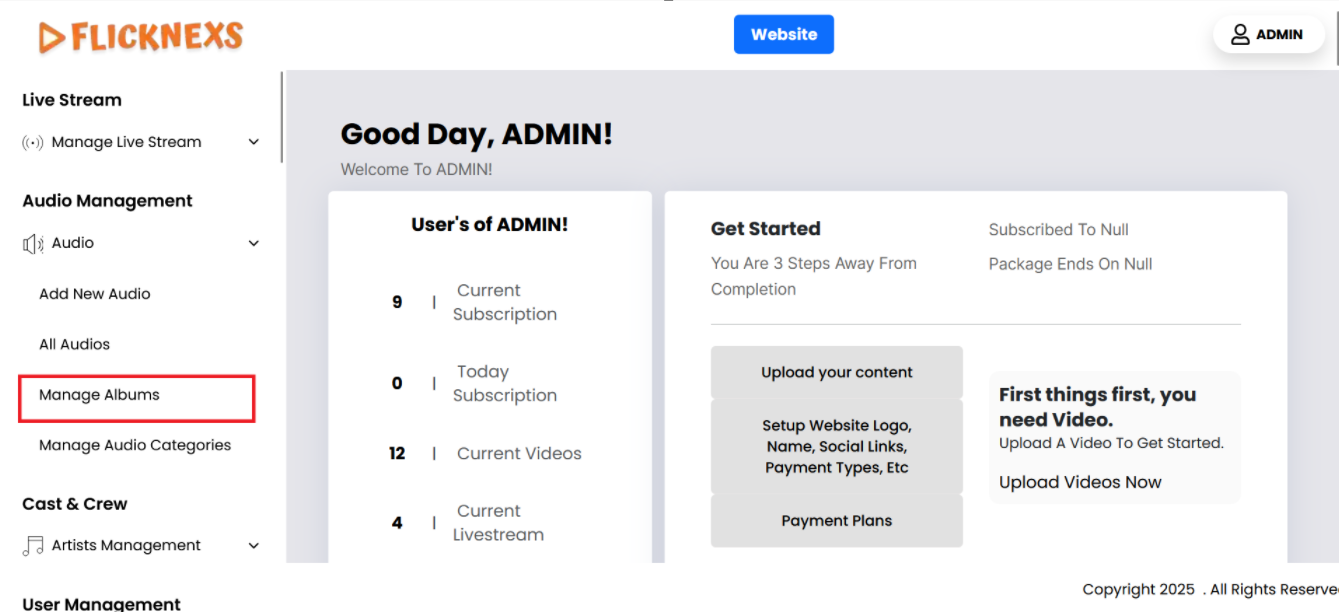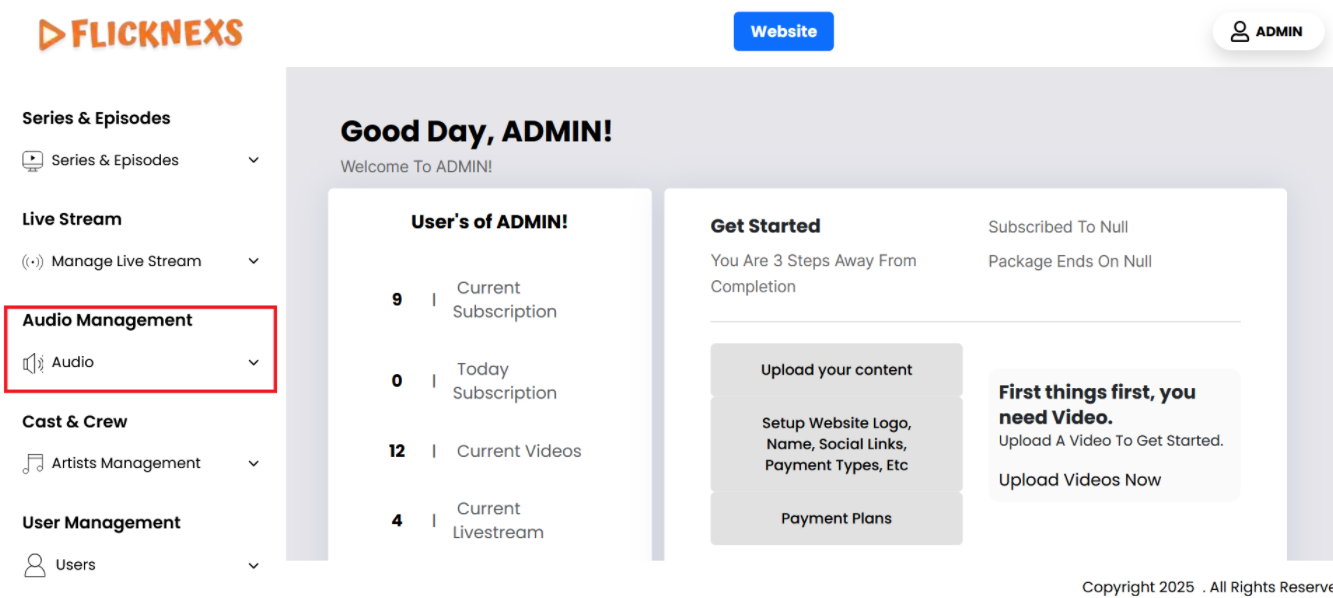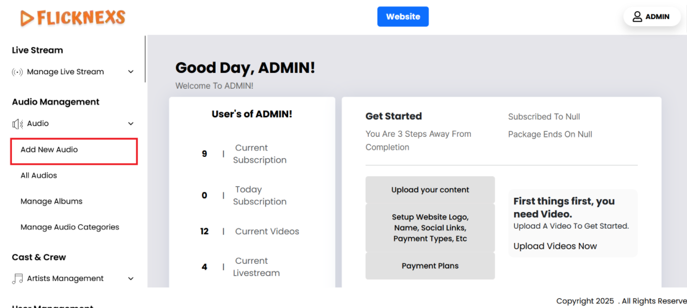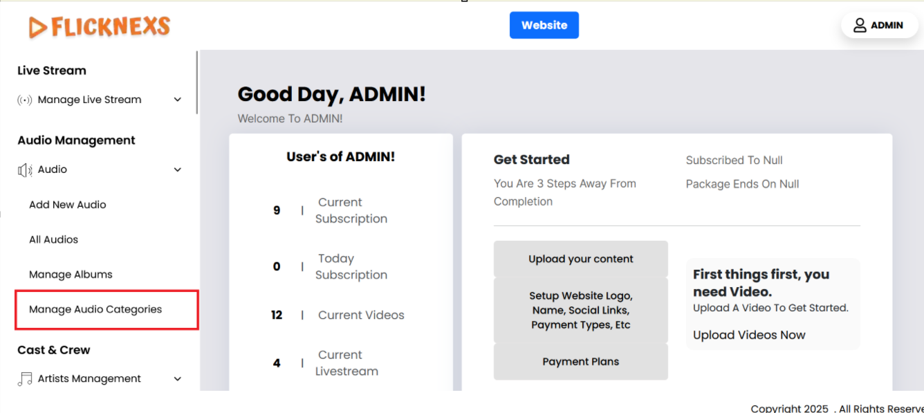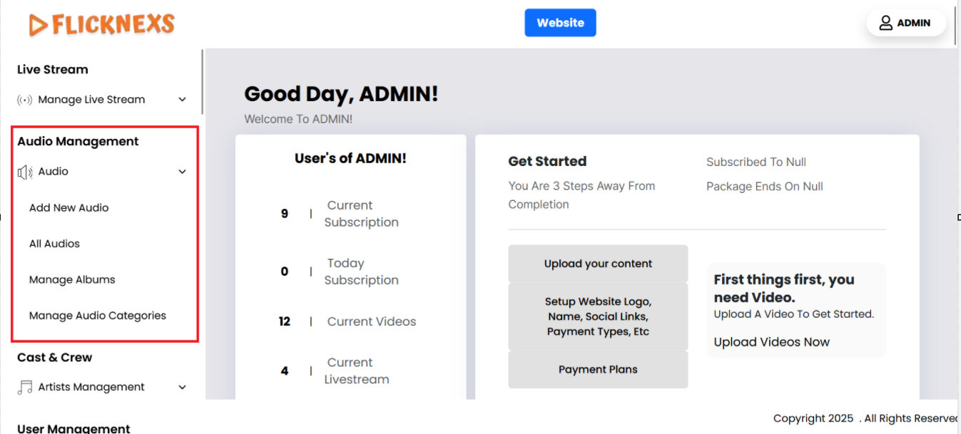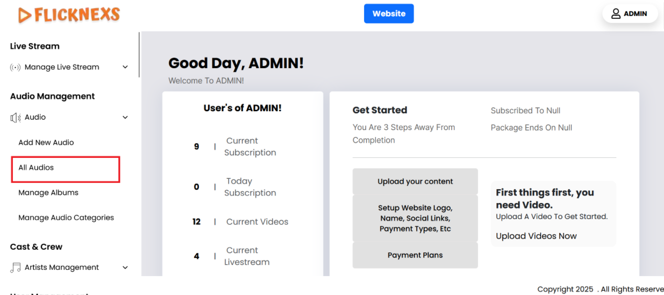 In the Admin panel, you will find various options listed on the left side of the page. To manage audios, please follow these steps: