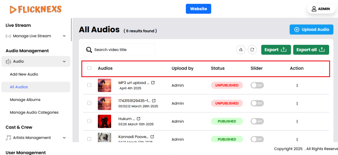 - Within the “Audio Management” section, there should be an option labeled “Audio List.” Click on this option to navigate to the page displaying all Audio content.