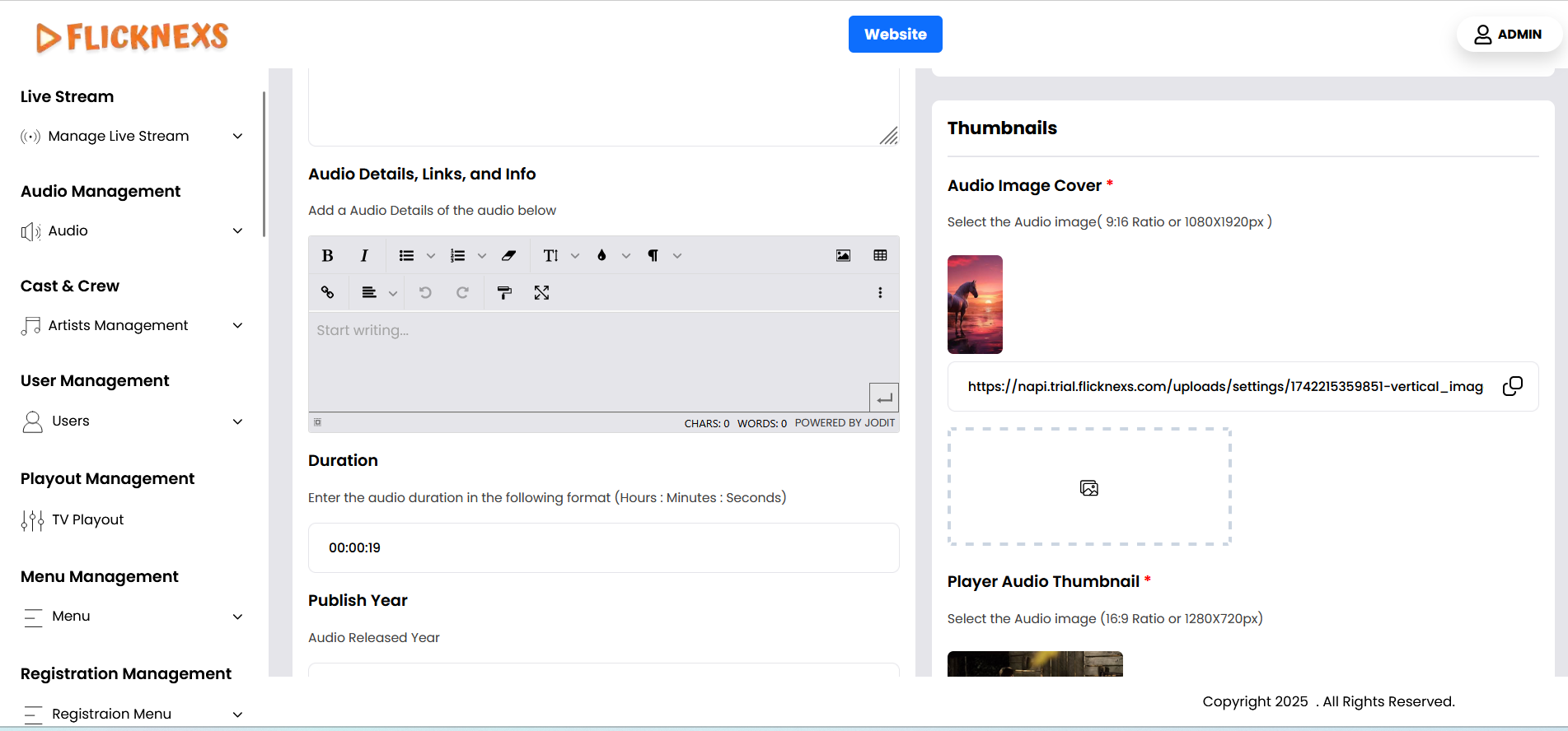 After Uploading Audio File: Once the audio file is uploaded successfully, clicking the “Next” button will redirect you to the Audio File Meta Update page. This is where you will provide detailed metadata and information related to the audio file for proper categorization and display on your platform.