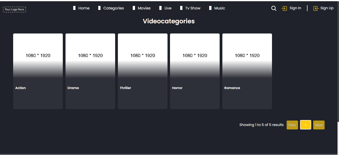 The Category Page displays different genres or video categories available on the platform. It helps users quickly navigate to a specific type of content (like Action, Romance, Horror, etc.) by visually showcasing each category as a card with an image and label. Clicking on a category redirects users to a list of videos under that genre.