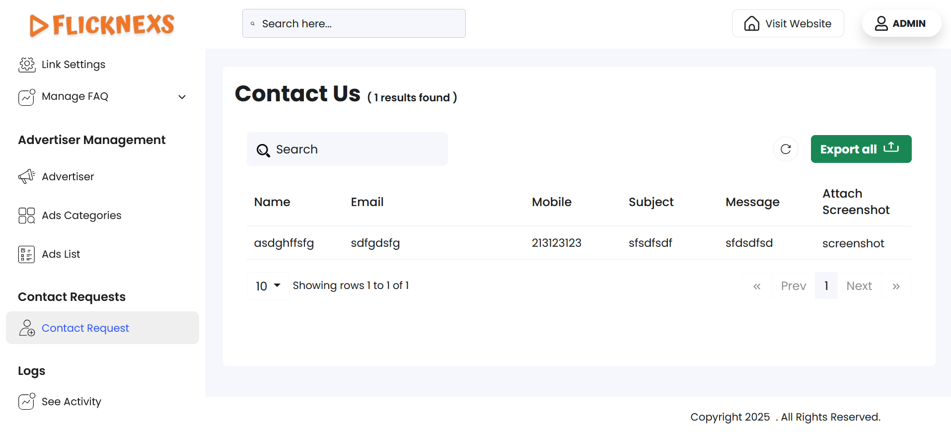 - For record-keeping, reporting, backups, or sharing data outside the system, you can export all contact request data directly by clicking on ‘Export All’, located at the top-right corner of the table. You will find the following format options:
