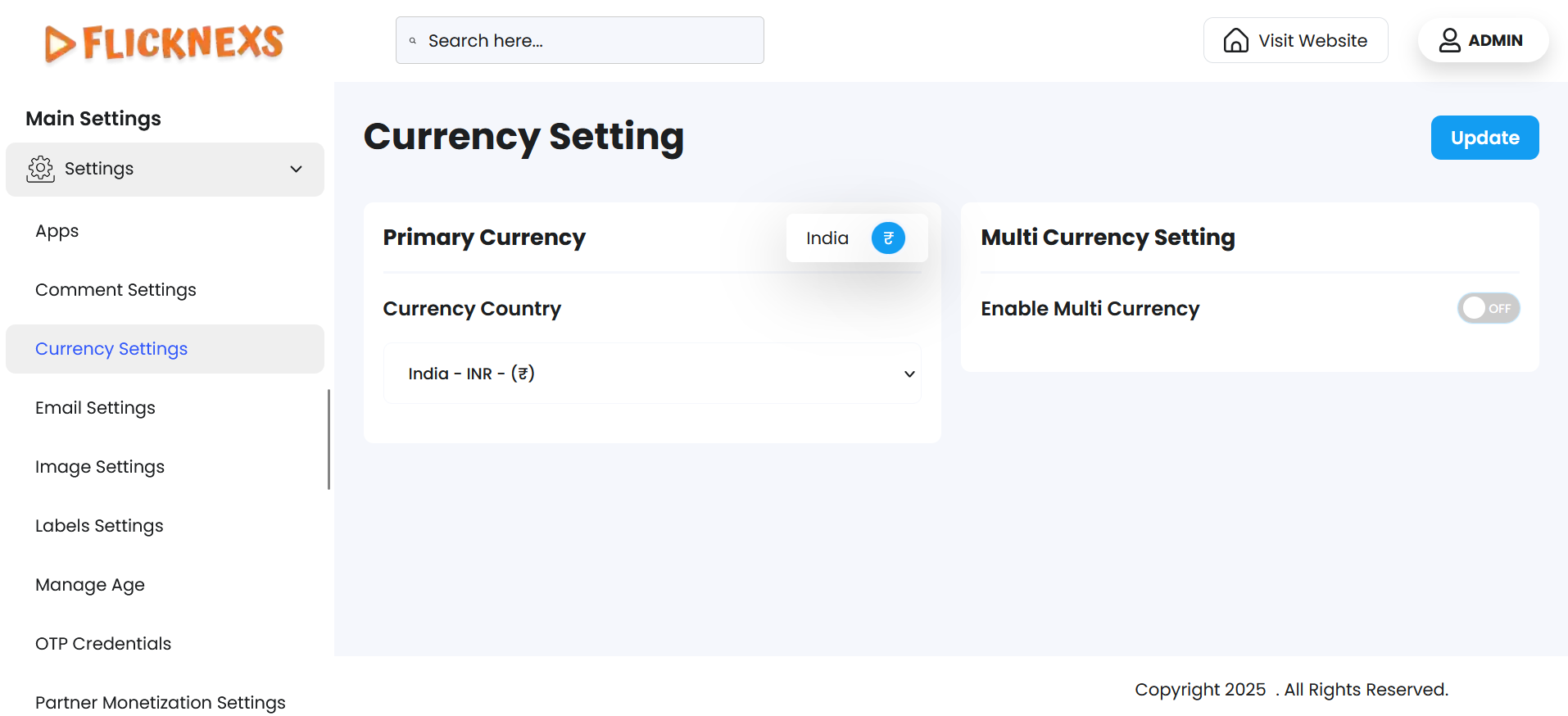 The Currency Settings section allows you to define and manage the default and supported currencies used throughout your OTT platform, especially for subscriptions, Pay-Per-View (PPV), and other monetized content.