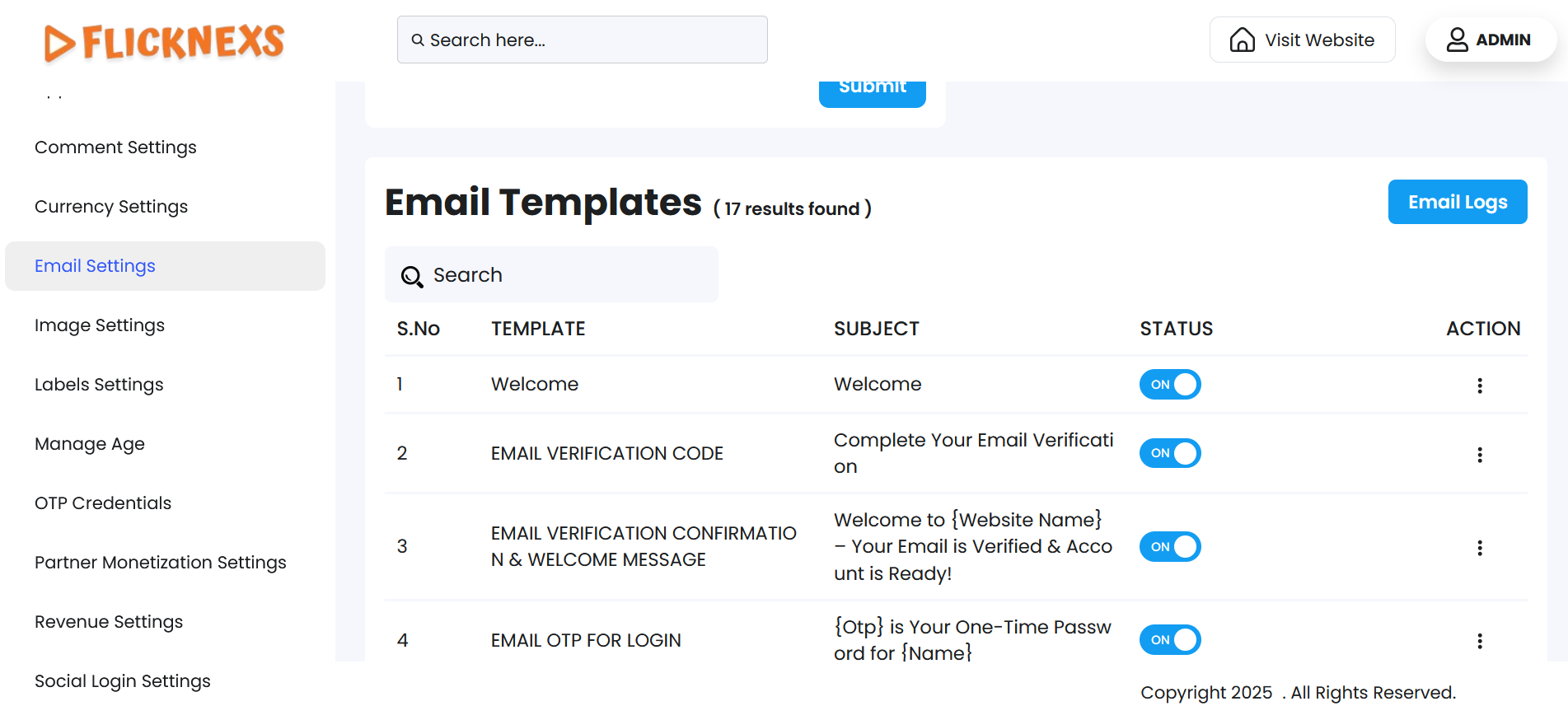 - Status: Displays the toggle button to enable or disable the specific email template, which, if enabled, sends the email automatically to users, and if disabled, the email will not be sent. A toast notification ‘Email Template Updated Successfully’ will appear to confirm the update.