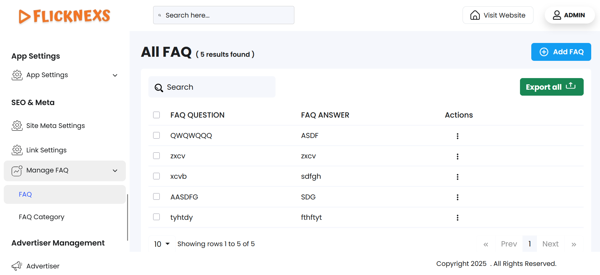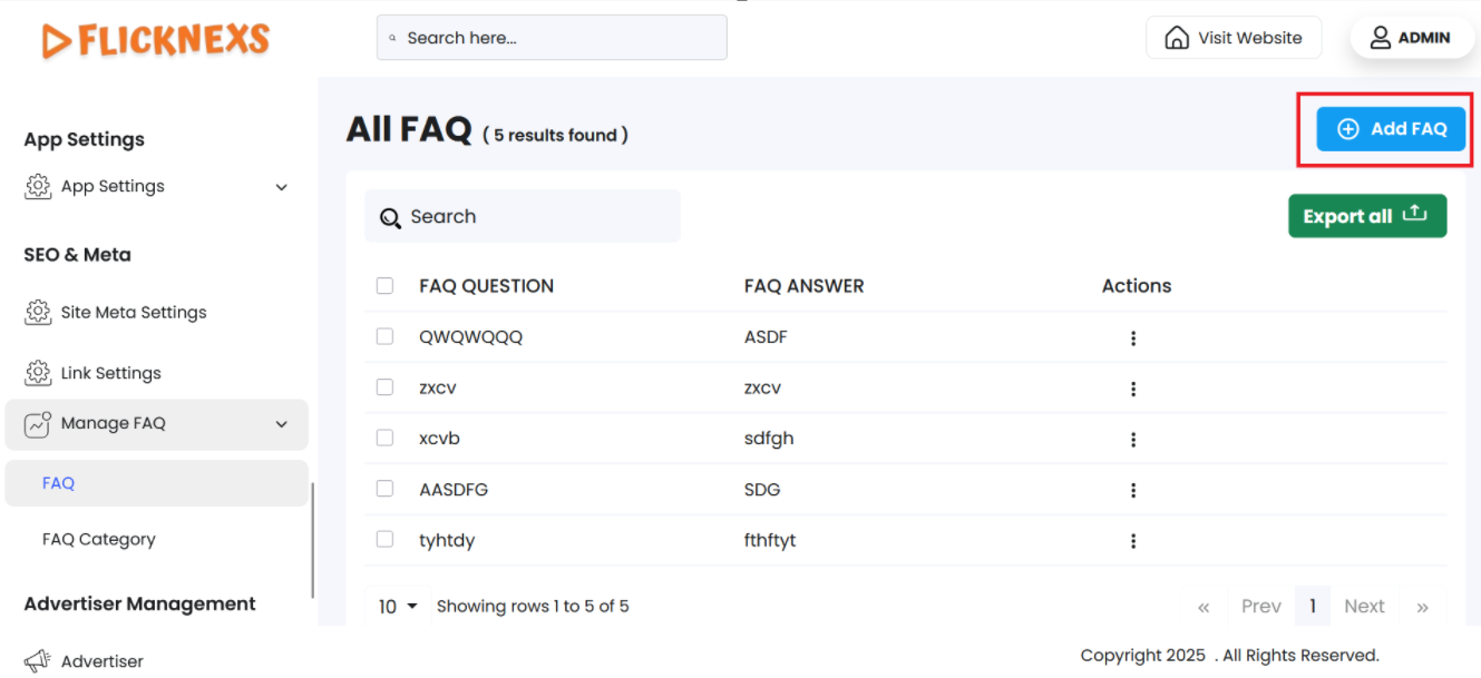 - Use the dropdown menu (showing options – 5, 10, All) to set the number of FAQ records displayed per page.