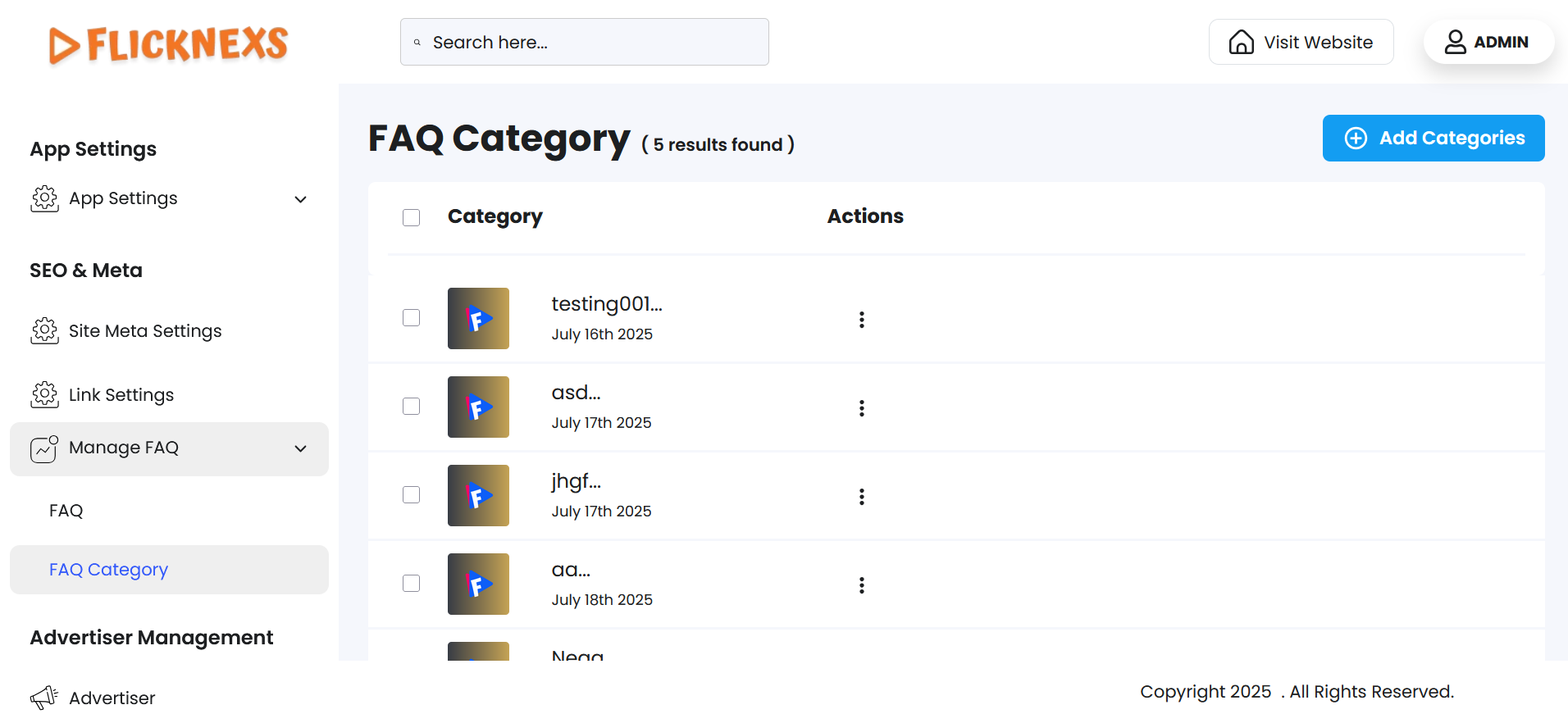 Clicking on the ‘FAQ Category’ section will open a list view labeled ‘FAQ Category’ to allow you to create, view, and manage all the categories added to the platform.