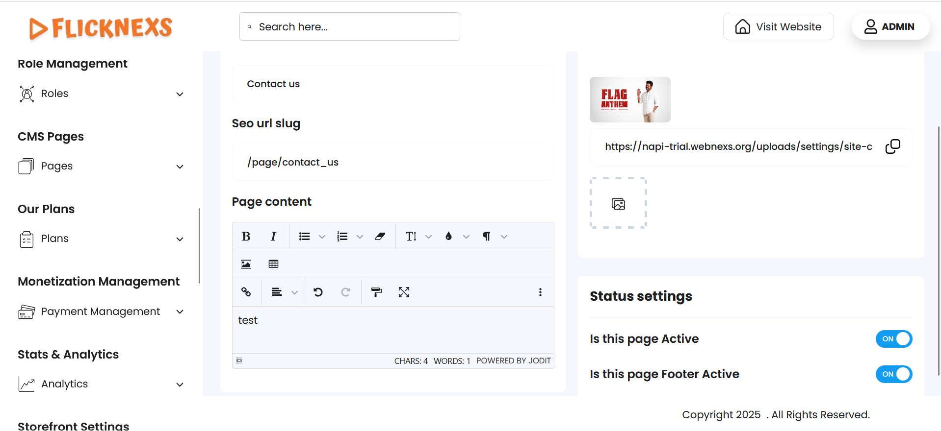 - Is This Page Footer Active: This option allows you to display the page link in the footer of the homepage. Enabling it will show the page in the footer while disabling it will remove the link from the footer.