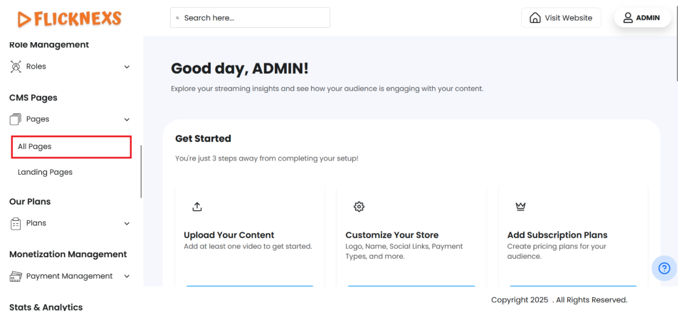 - Navigate to the CMS Pages Section: Scroll down through the menu options until you locate the “CMS Pages” section. This is where you’ll be able to view, create, and edit the content pages on your platform.