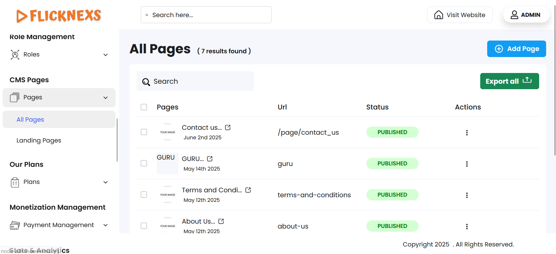 In the Pages section, you can view and manage a list of all pages associated with your platform. Each page entry provides essential details and actions: