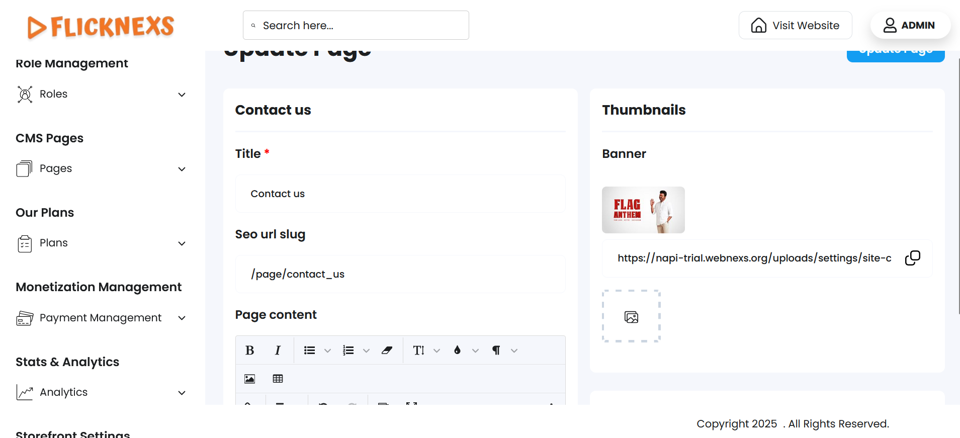 These settings allow you to control the visibility, content, and placement of each page on your platform, providing flexibility to keep your content updated and relevant for users.