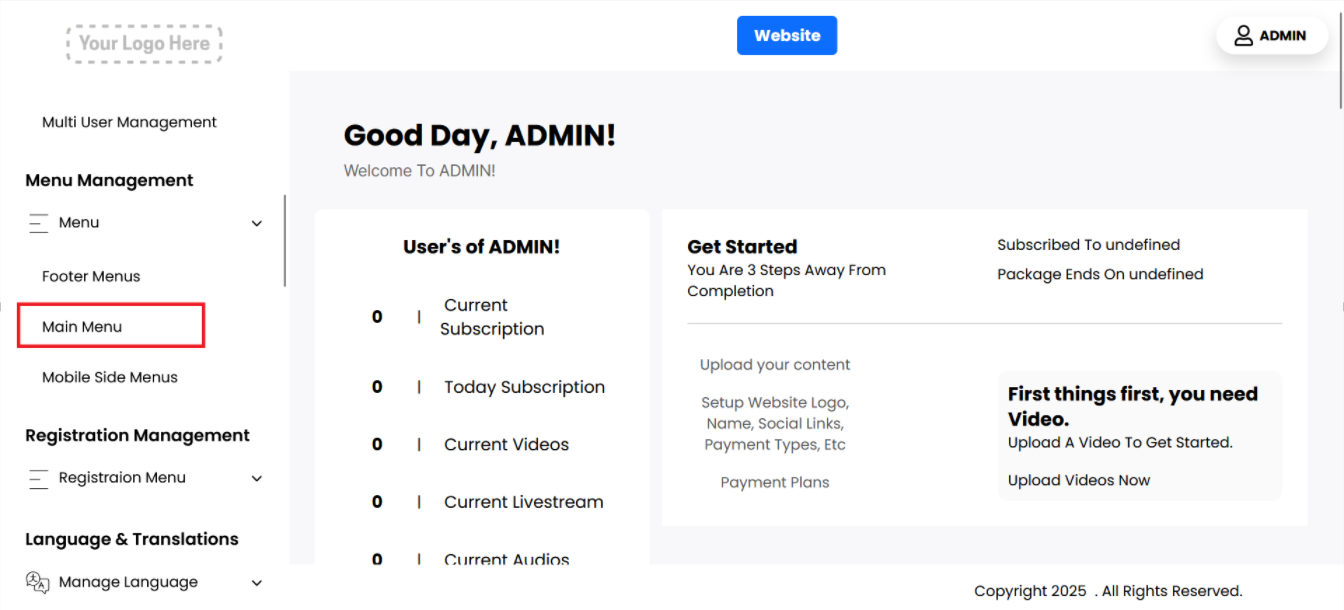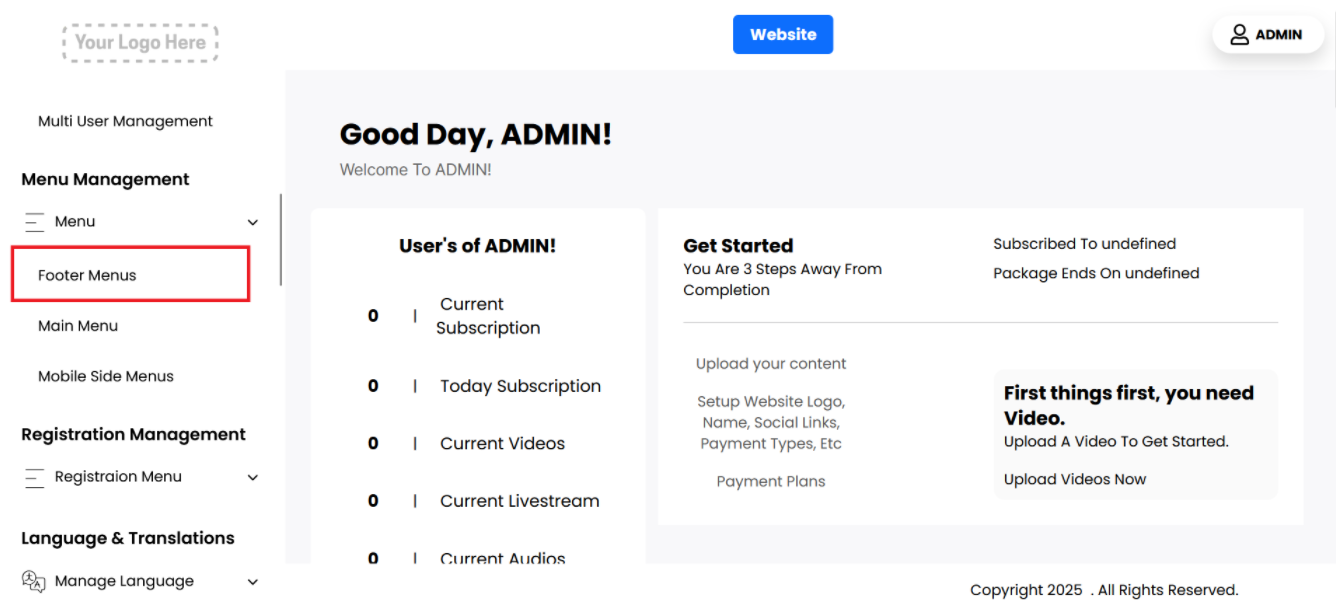 From the Admin Dashboard, you can create and manage menu items that appear at the top (header) or bottom (footer) of your platform. These menus typically include links to important pages such as Home, About Us, Contact, FAQ, Privacy Policy, Terms & Conditions, Categories, or custom URLs.