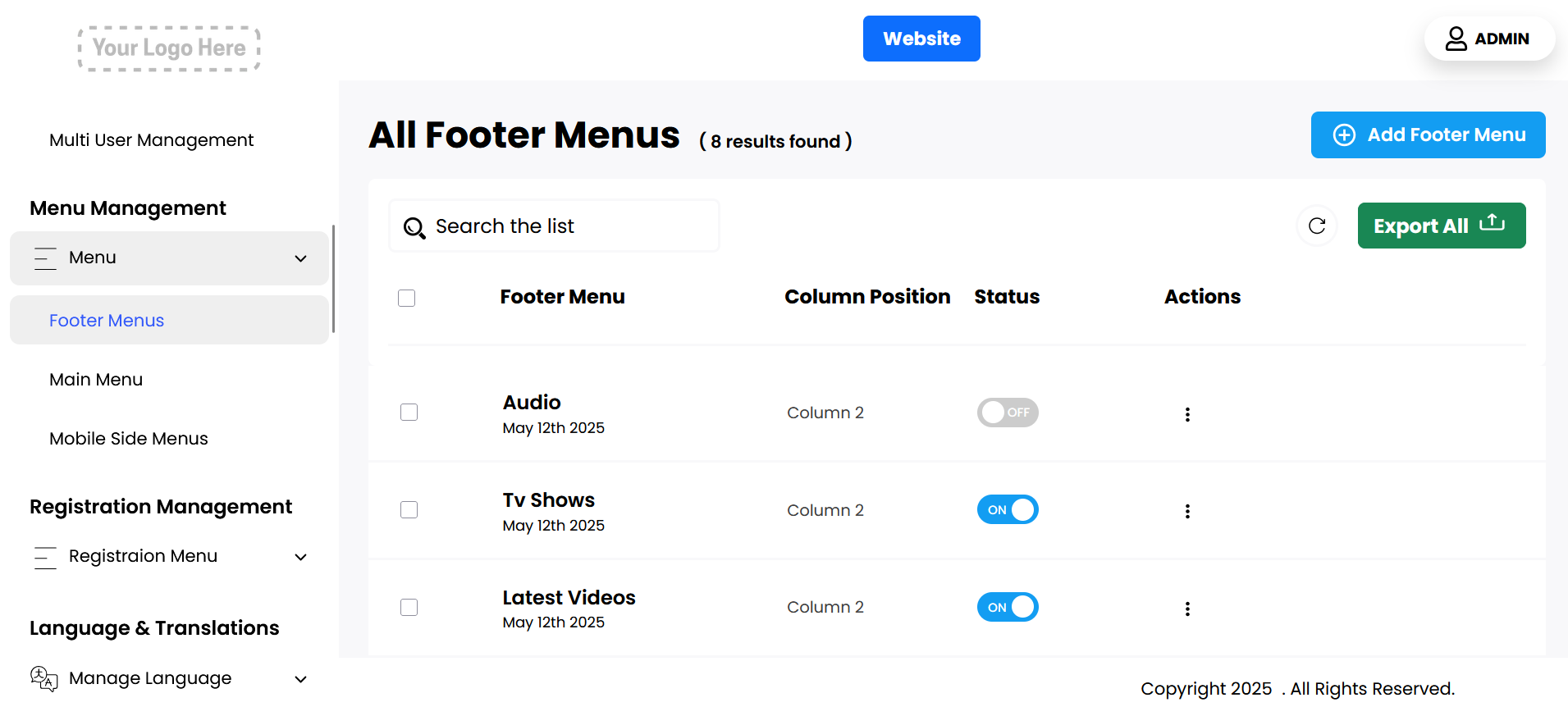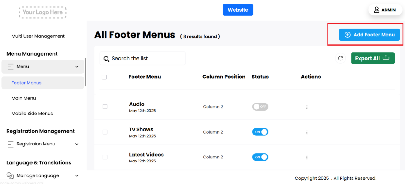 You can view a comprehensive list of footer menus, which includes several key attributes for each menu item: