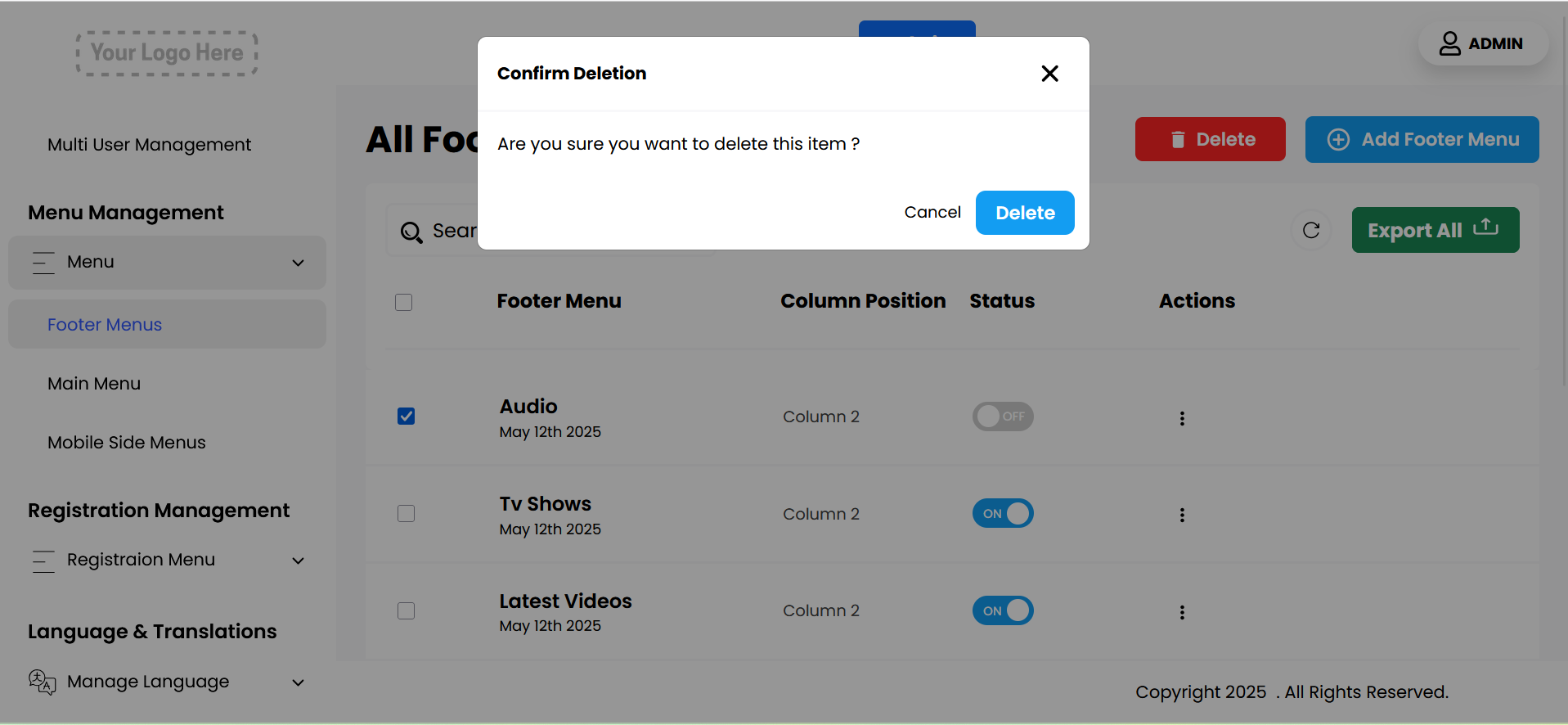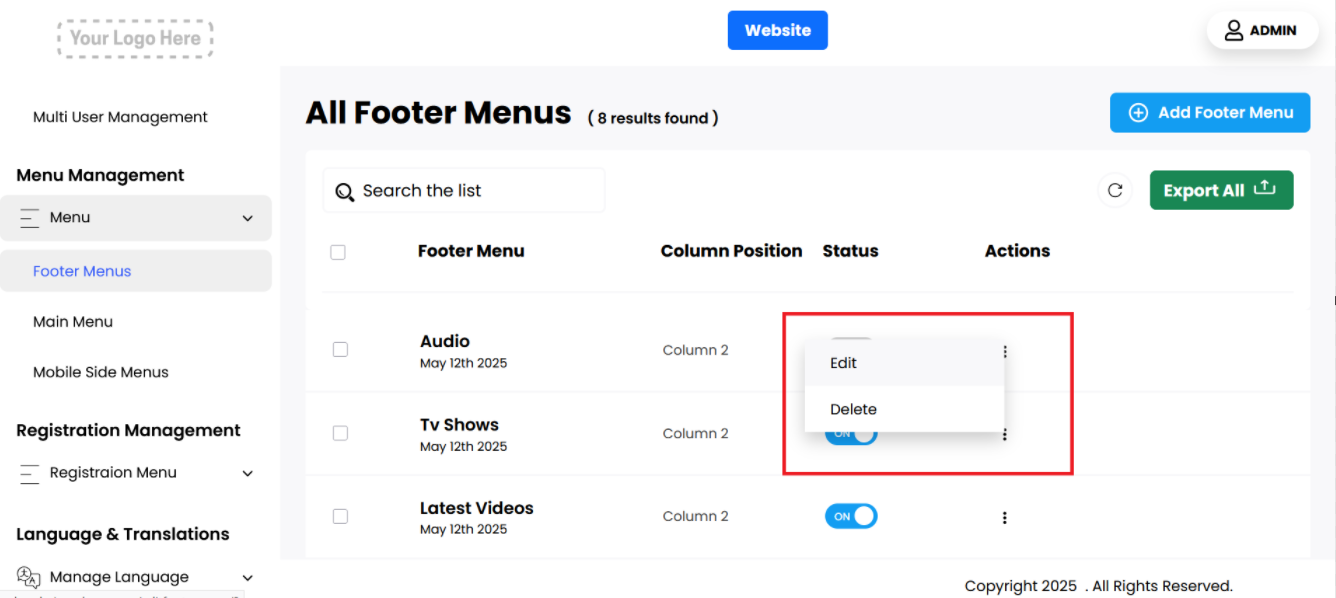 - Delete: If you decide that a menu is no longer needed, you can select this option to permanently delete it from the footer menu list.