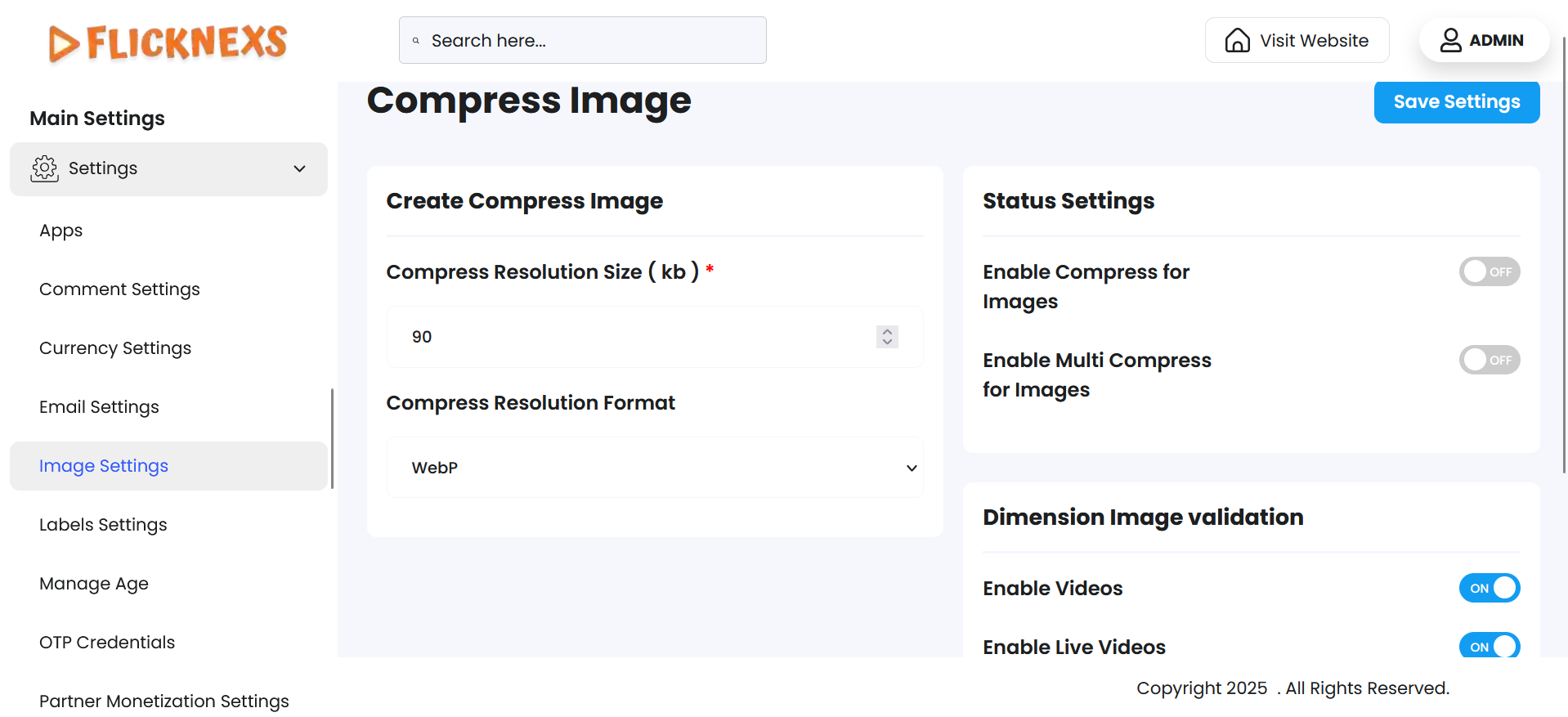 The Image Settings section allows you to manage and configure image-related preferences across your OTT platform. These settings ensure that images are optimized for performance, compatibility, and visual consistency on both web and mobile platforms.