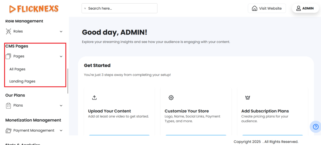 - Navigate to the CMS Pages Section: Scroll down through the menu options until you locate the “CMS Pages” section. This is where you’ll be able to view, create, and edit the content pages on your platform.