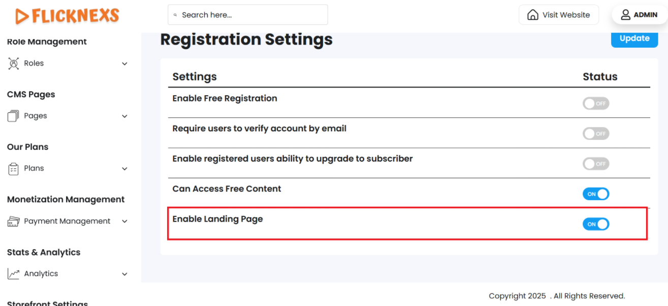 After creating a new landing page, you can make it visible to users by enabling it in the Storefront Settings. Here’s how to set your newly created landing page as the main entry point for your platform: