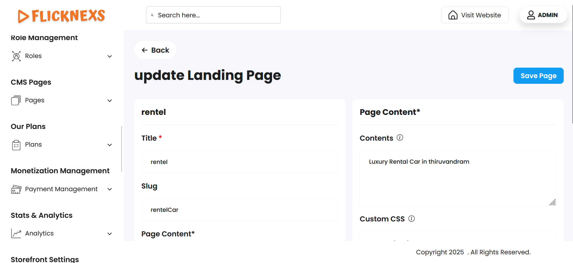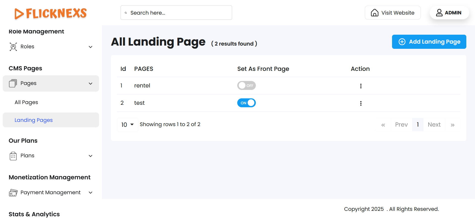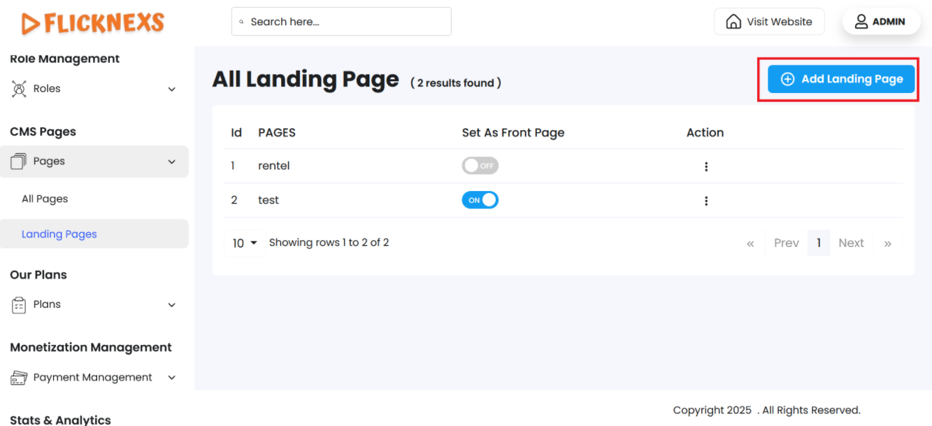 - Set As Front Page: This toggle option allows you to set any landing page as the platform’s main front page. Enabling it will display this landing page as the homepage; disabling it will remove it from the front page position.