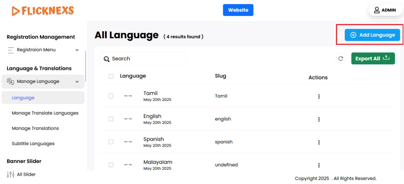In the ‘Language’ section, you will see a comprehensive list of all the video languages that have been added to the platform. Each entry in this list is displayed alongside a thumbnail image representing the language, making it easy to visually identify each option. Additionally, you will find the name of each language clearly labeled next to its corresponding thumbnail.
