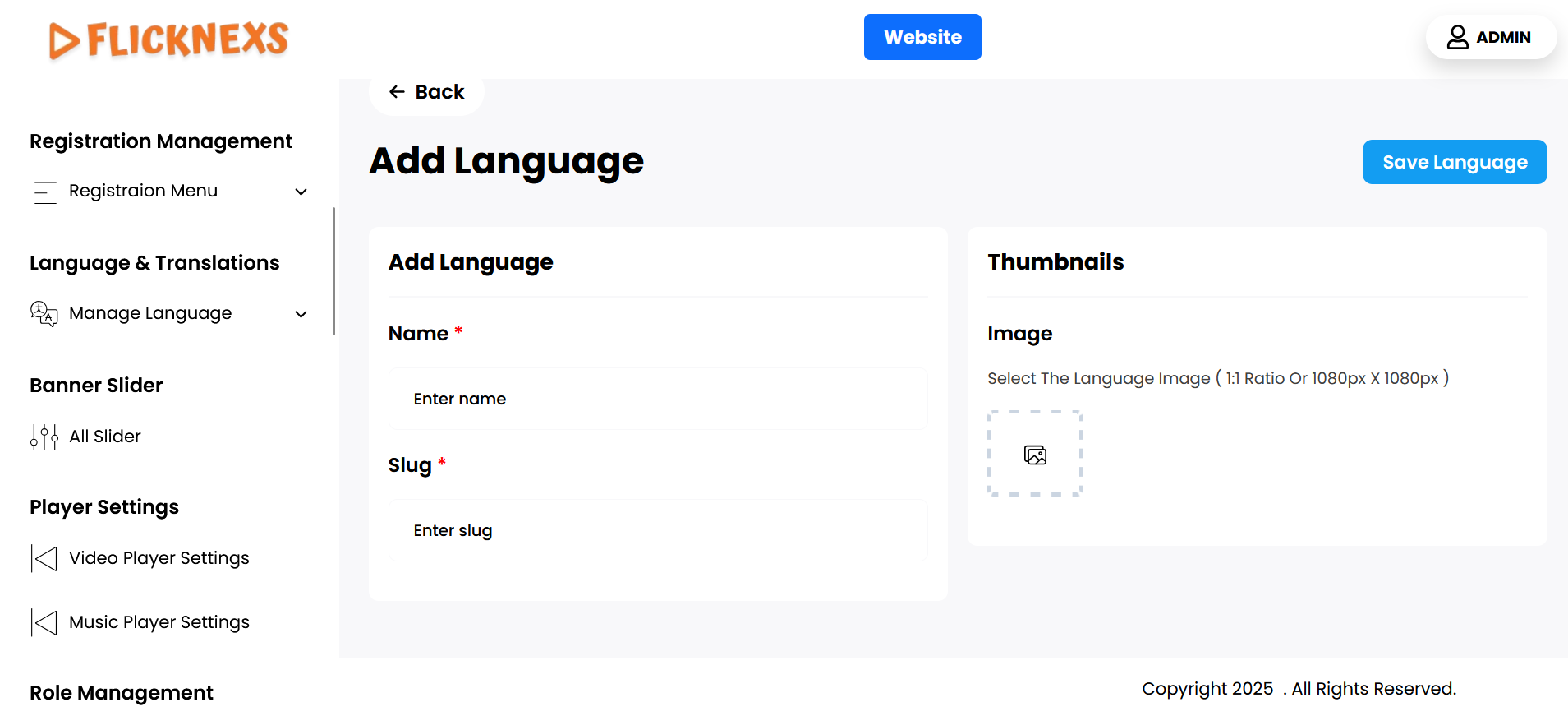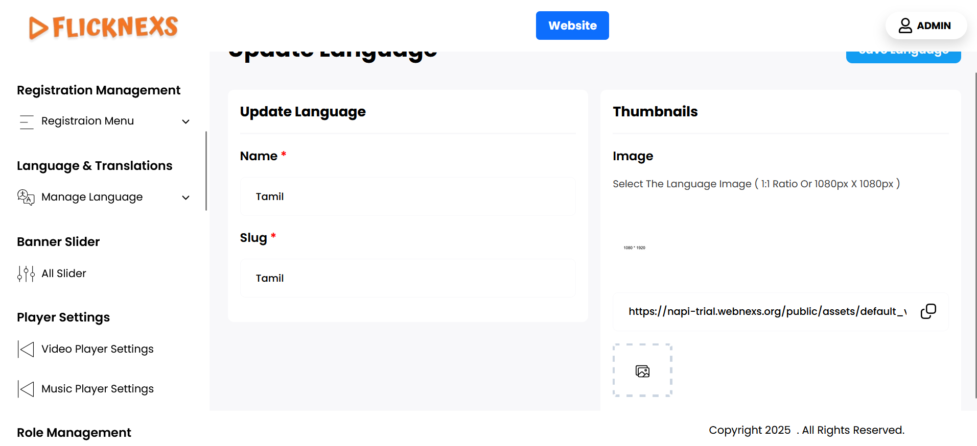 - Next, you will need to upload a thumbnail image that visually represents the language. This image will be displayed alongside the language name in various parts of your platform, such as in the language selection dropdown or settings.