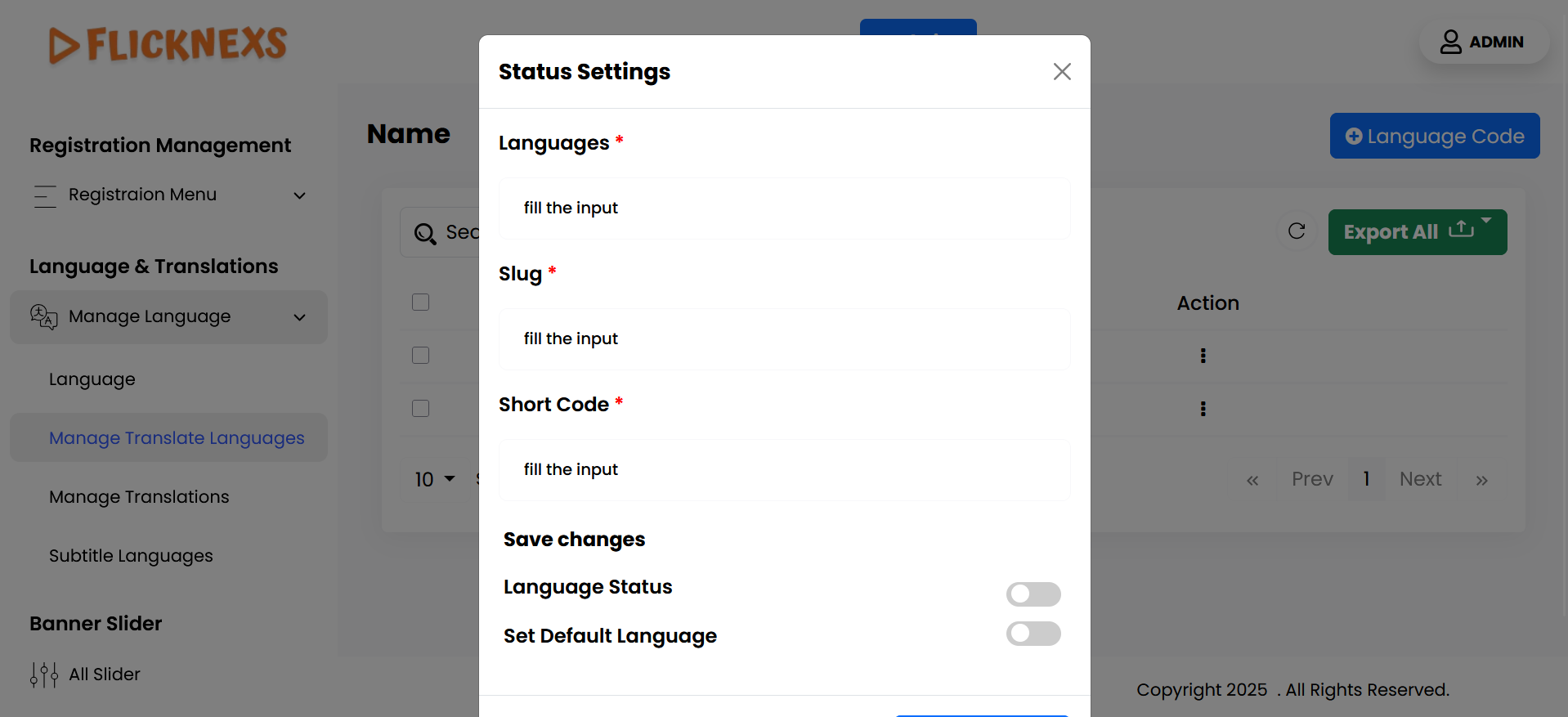 - Short Code: A unique identifier or slug for the language, such as “EN” for English or “FR” for French.