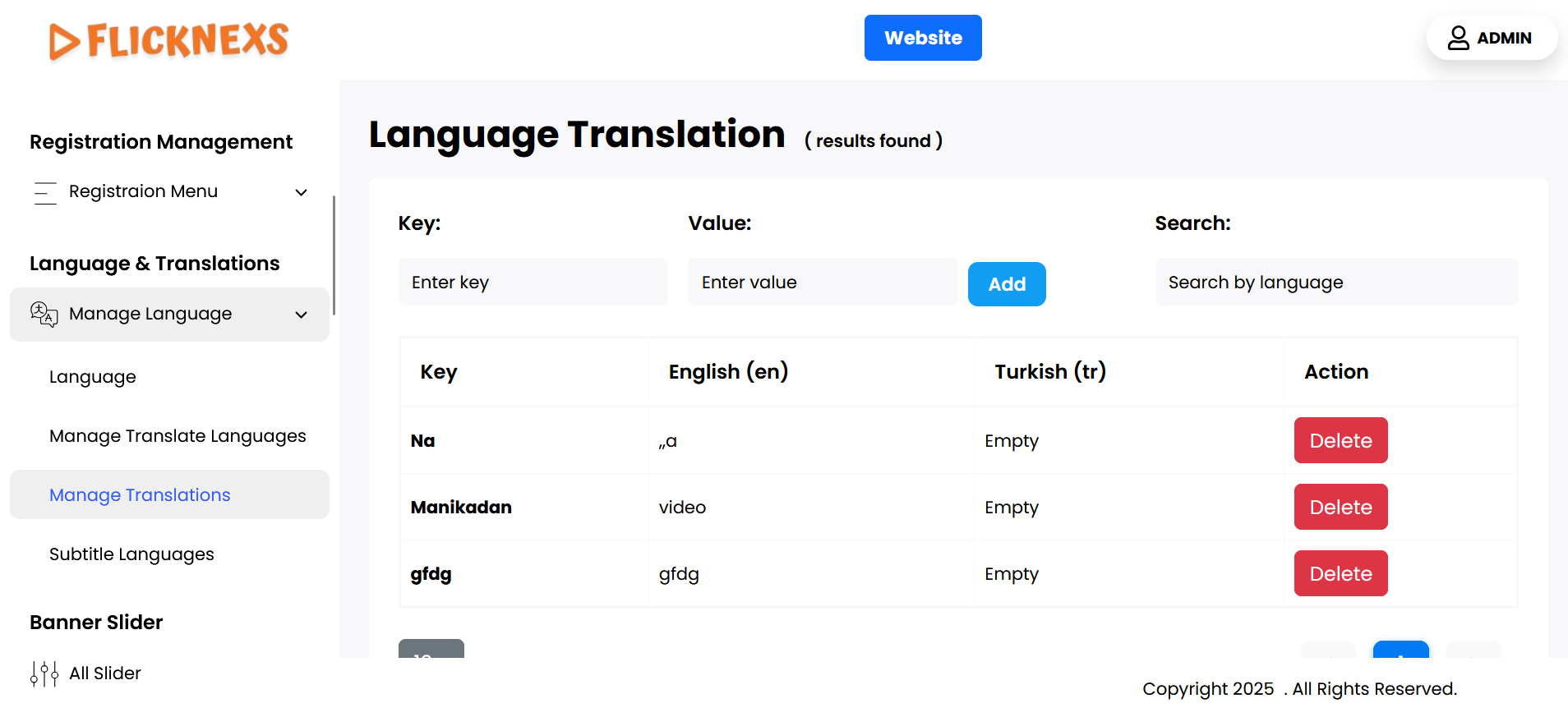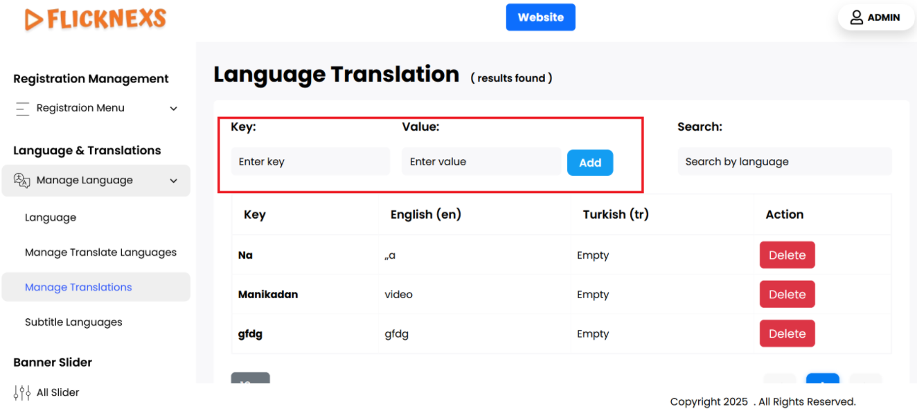 - Search: To help you easily manage a large number of translation words, a search option is available. You can use this feature to quickly locate a specific word by typing the key into the search bar. This saves time when you need to edit or review translations for a particular term.