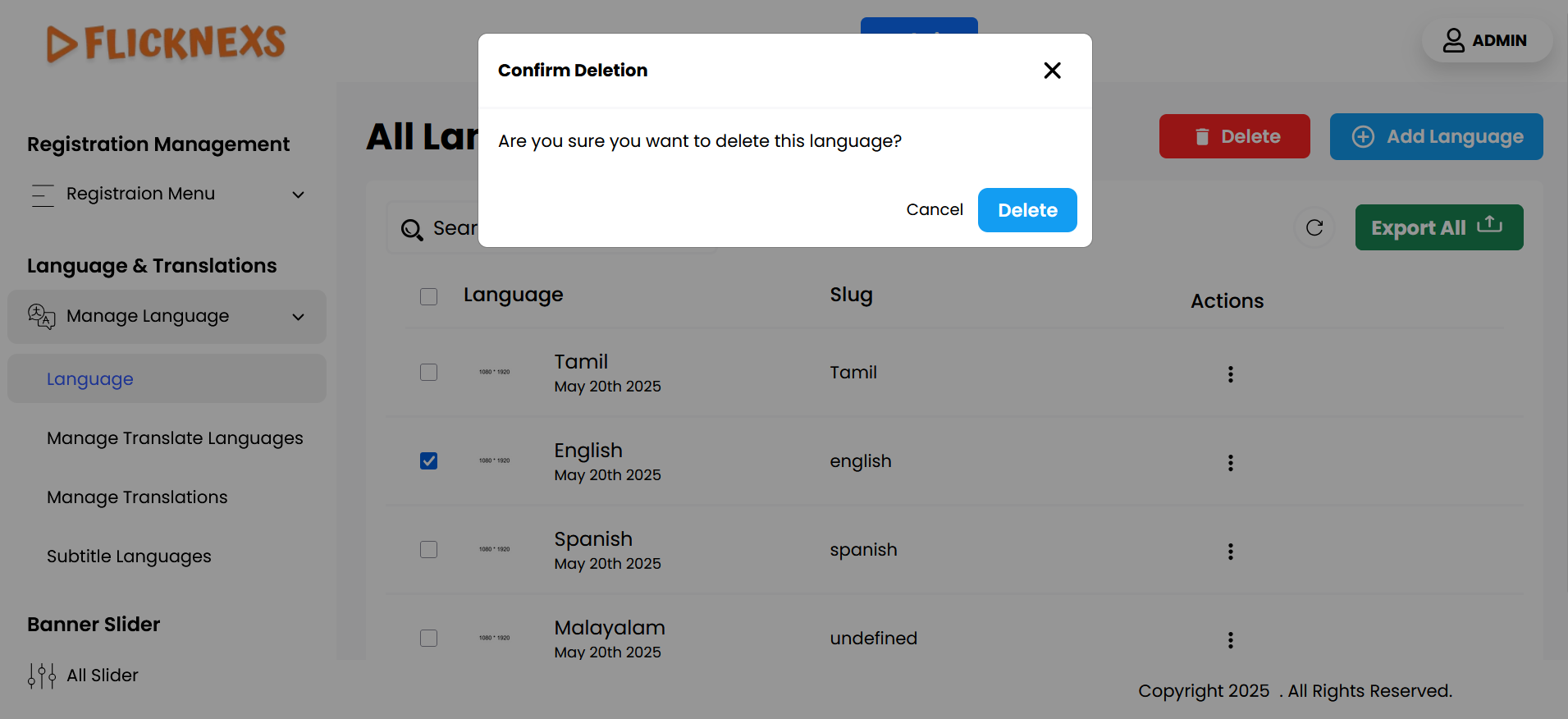 - Delete: This option lets you remove a language from the list entirely. Before proceeding with deletion, a confirmation message is displayed to prevent accidental removal of languages.