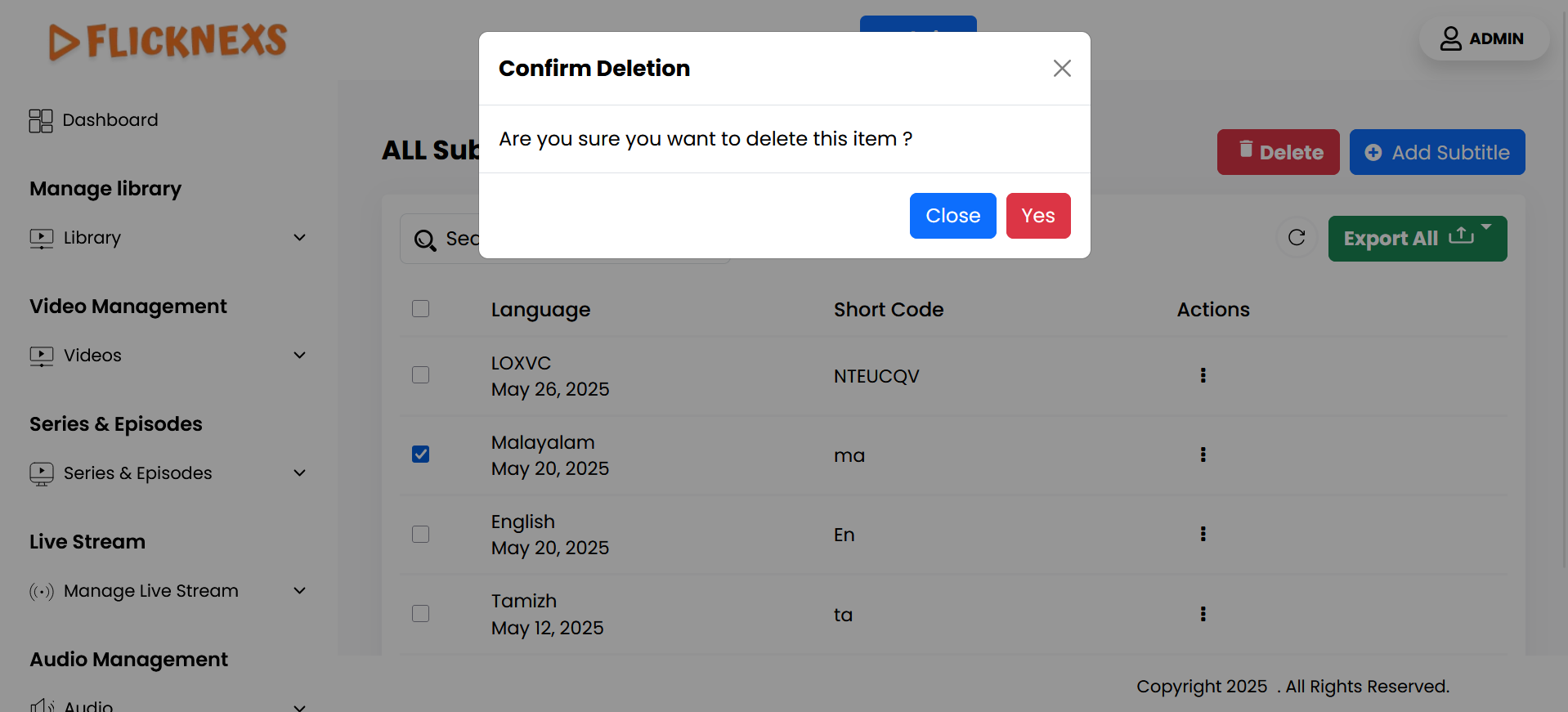 - Delete: Enables you to remove a subtitle language from the list. Before deletion, a confirmation message will appear to ensure you want to proceed with the deletion.