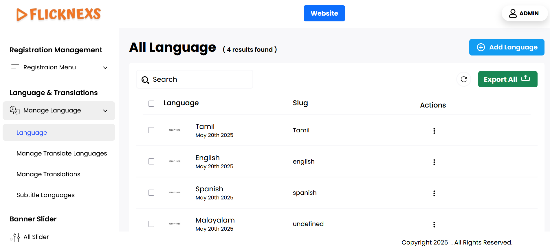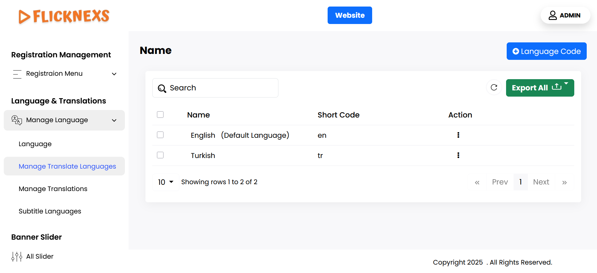 You can view a list of all available translation languages, each displayed with the name of the language. Alongside each language entry, there are action options for managing the languages. These actions include two options: