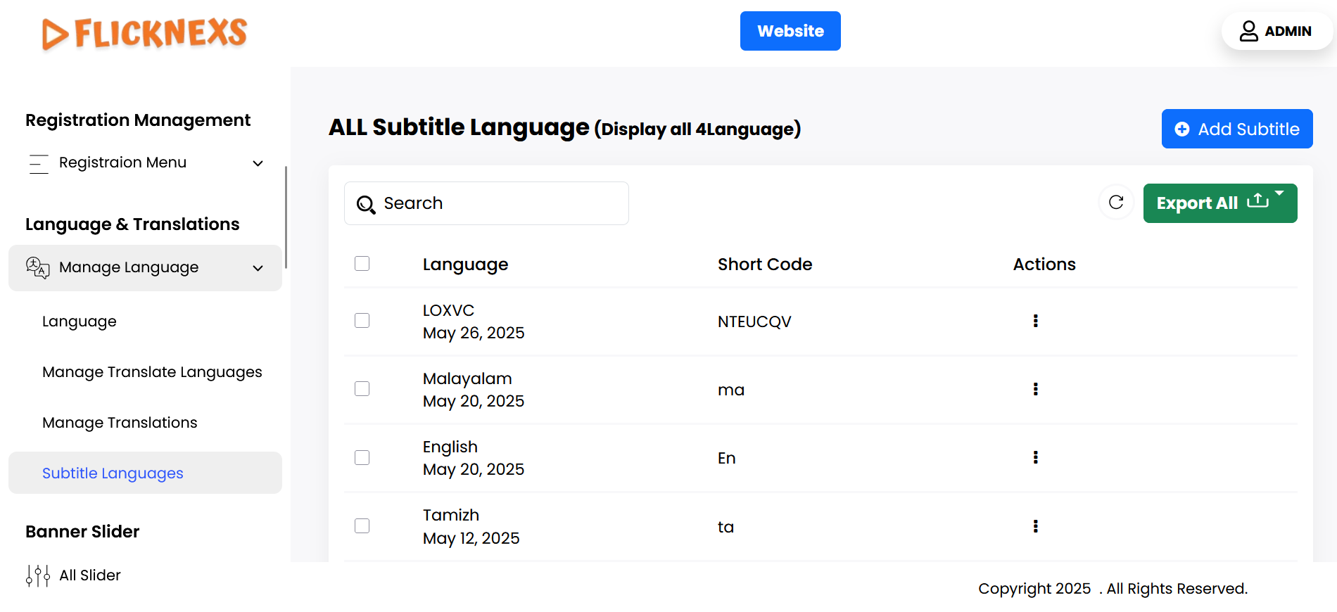 You can view and manage a list of subtitle languages with the following details: