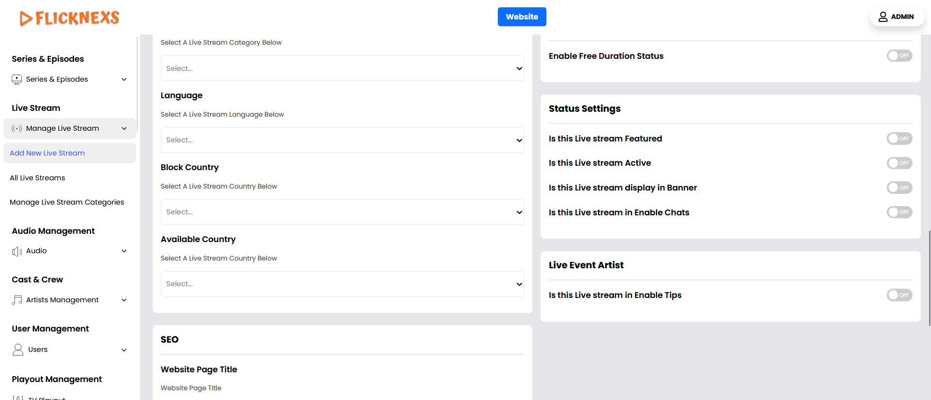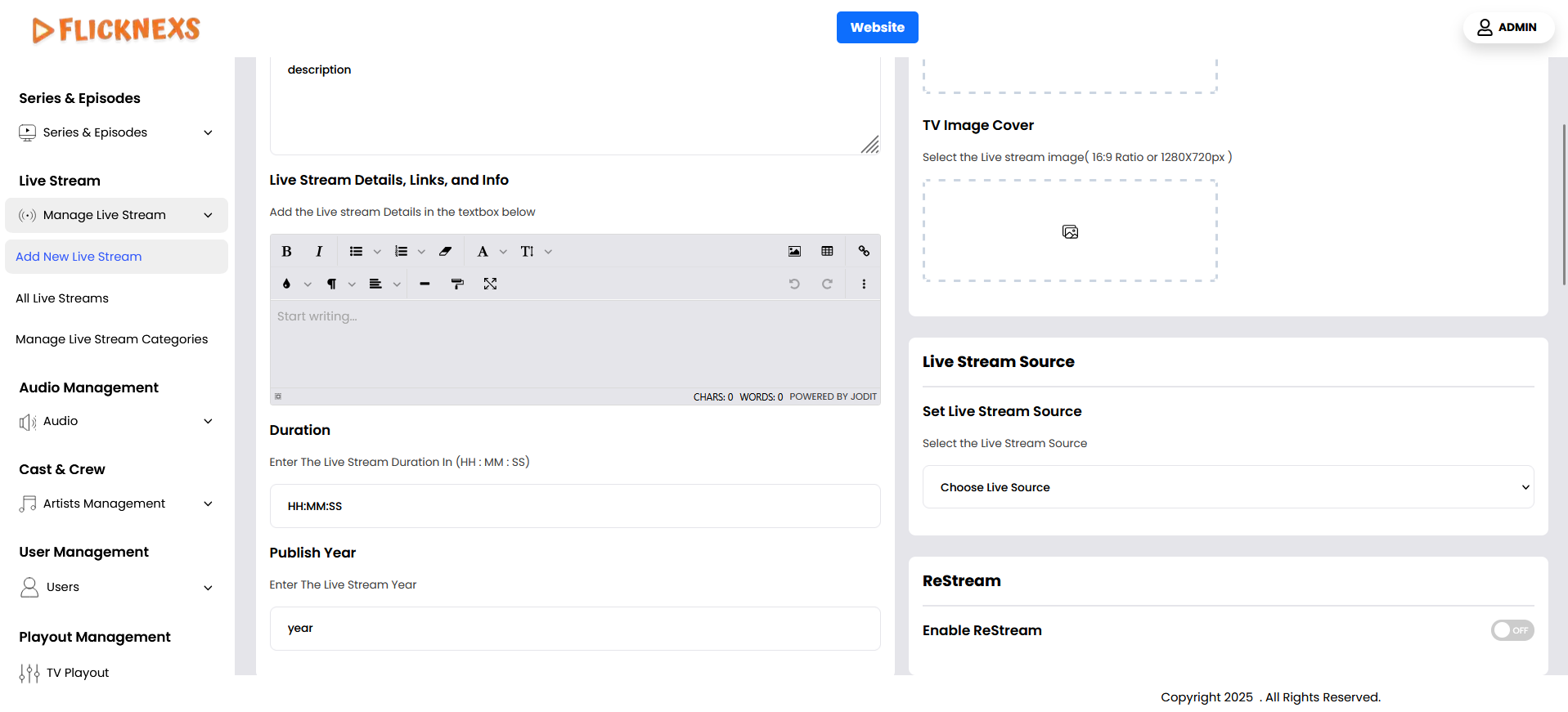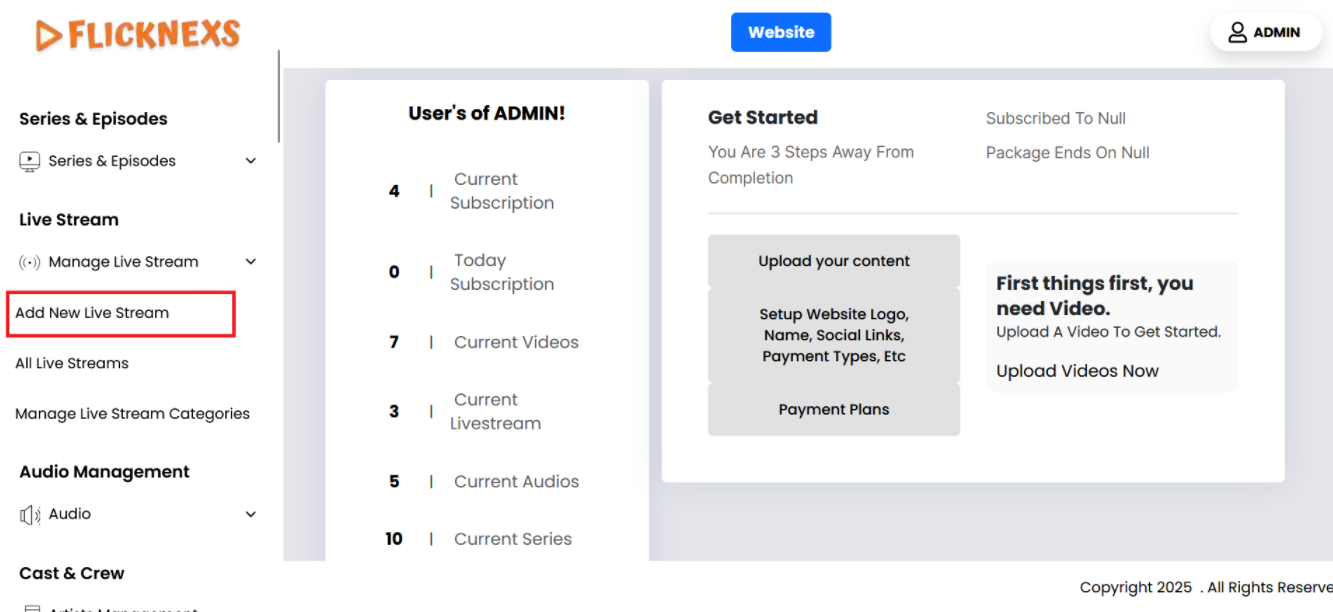 - Navigate to Add New Live Stream Section: In your platform’s admin panel or wherever live streams are managed, go to the section where you can add a new live stream.