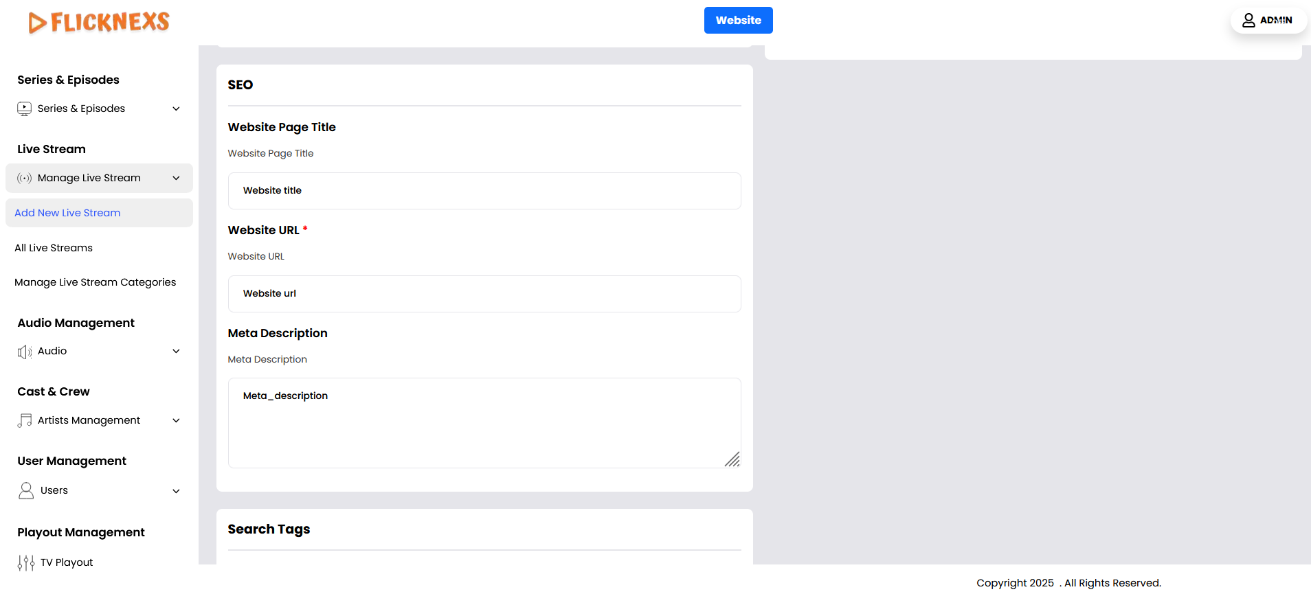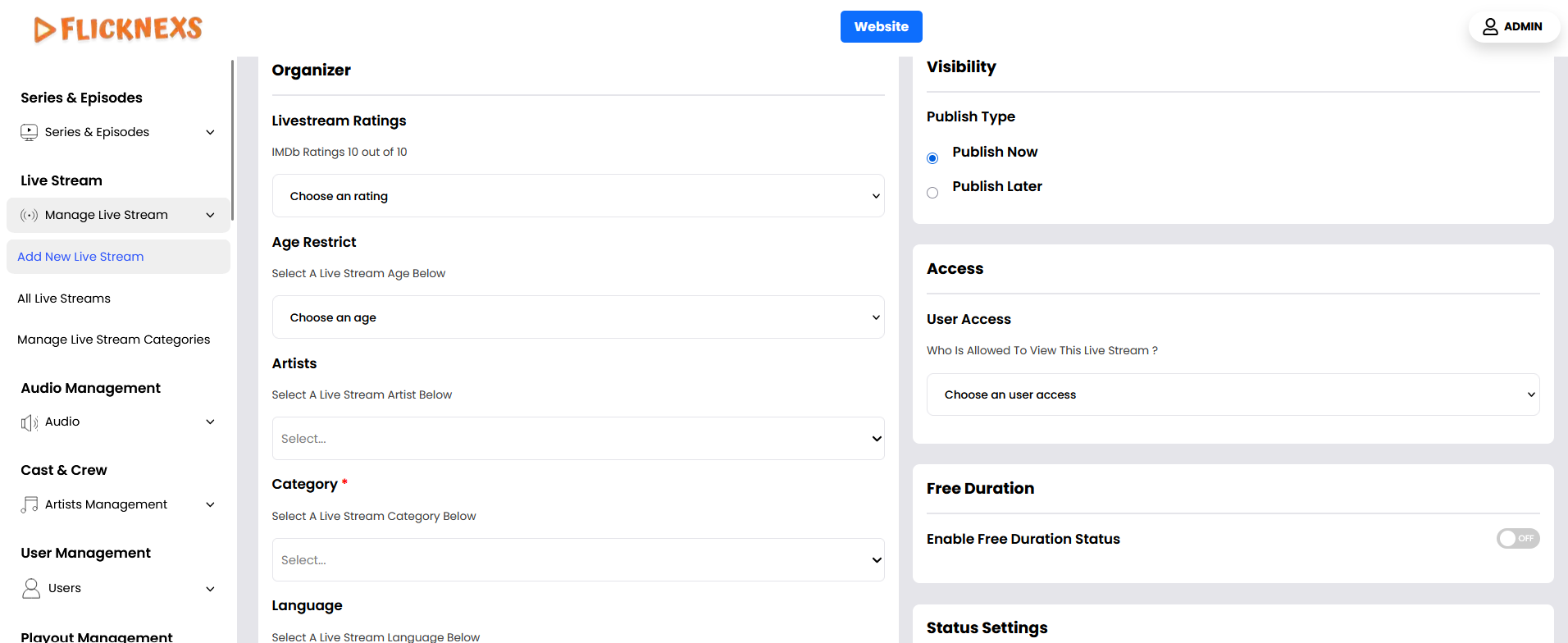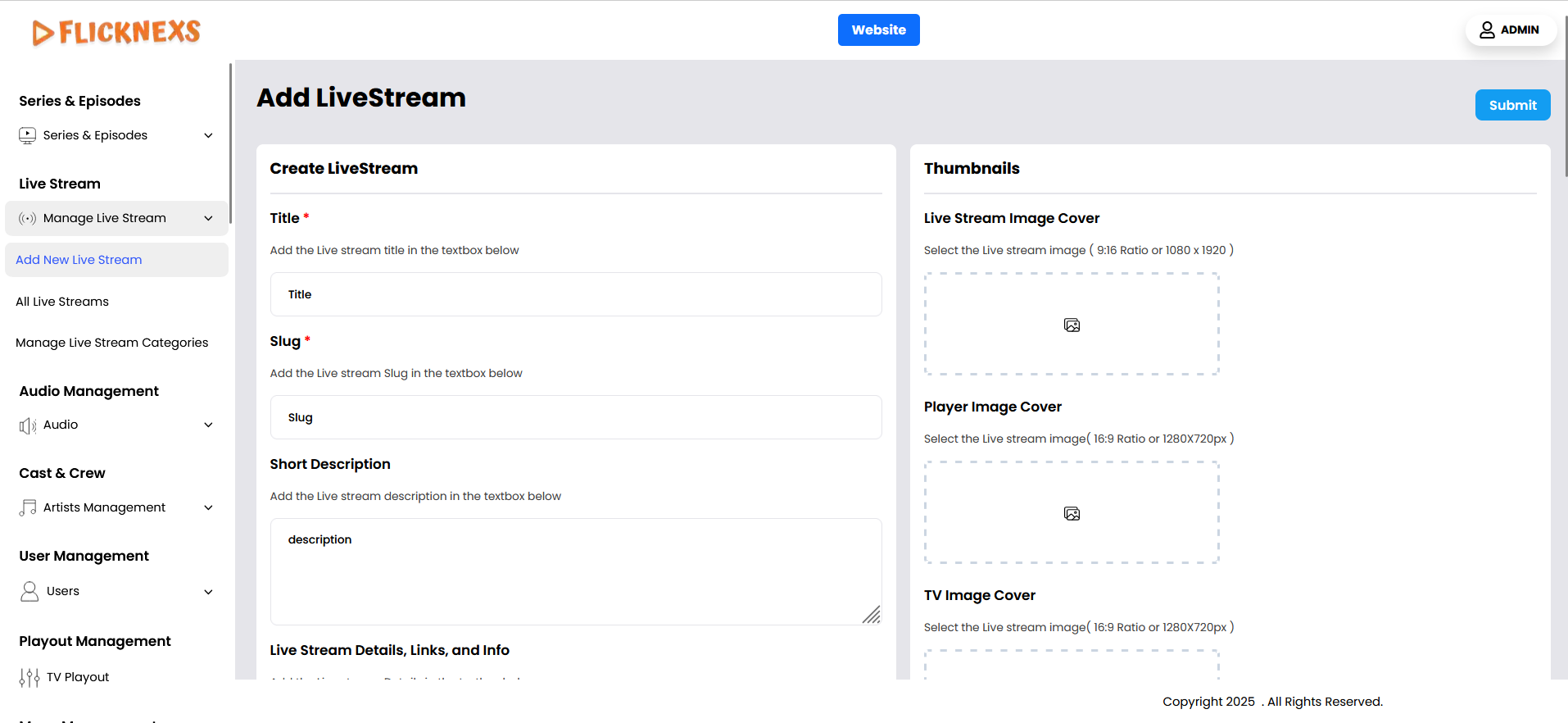 - Navigate to Add New Live Stream Section: In your platform’s admin panel or wherever live streams are managed, go to the section where you can add a new live stream.