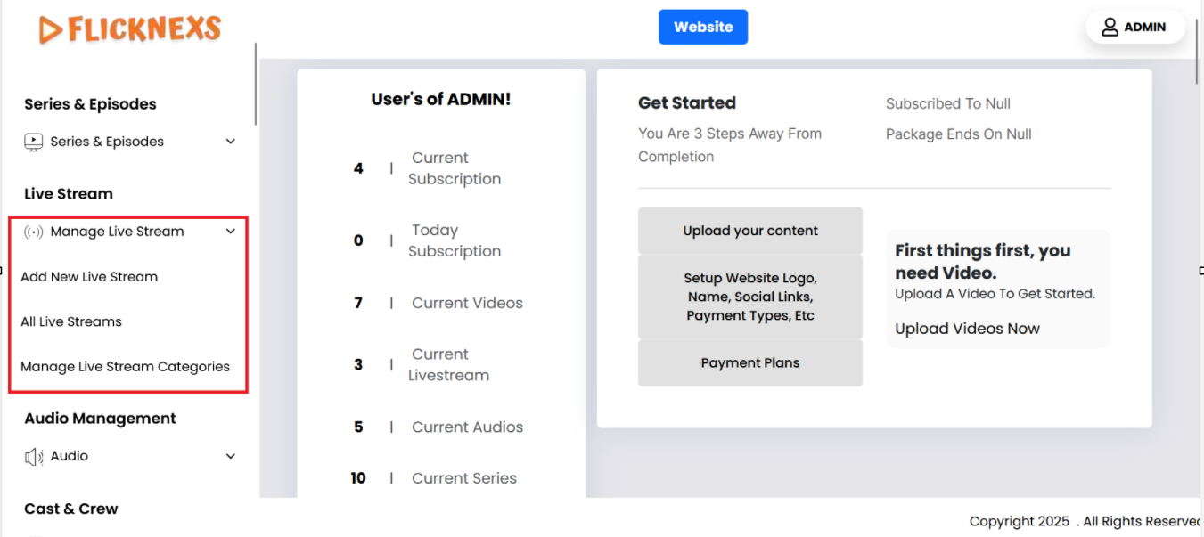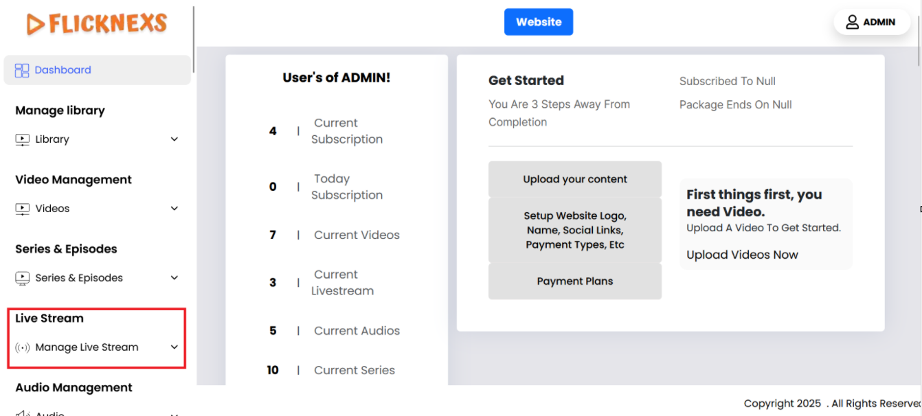In the Admin panel, you will find various options listed on the left side of the page. To manage Live stream videos, please follow these steps: