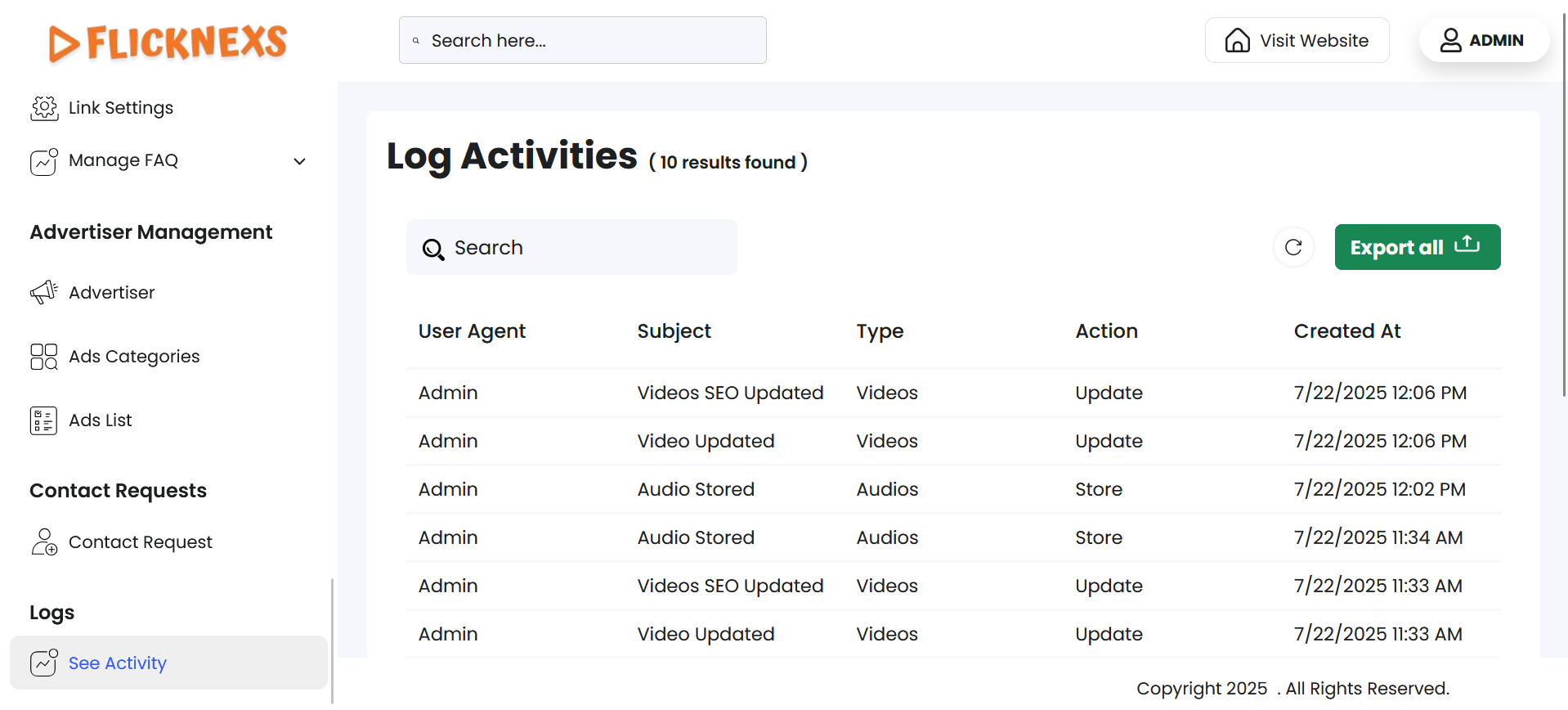 - For record-keeping, reporting, backups, or sharing data outside the system, you can export all log data directly by clicking on ‘Export All’, located at the top right corner of the table. You will find the following format options: