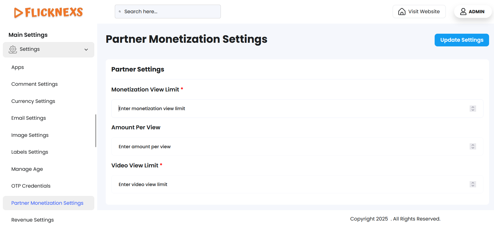 In these settings, you can define and customize the monetization process for the videos uploaded to your platform, giving you control over the view limits and earnings associated with video content. These settings allow you to set specific thresholds for when content can start generating revenue, as well as how much partners earn per view.