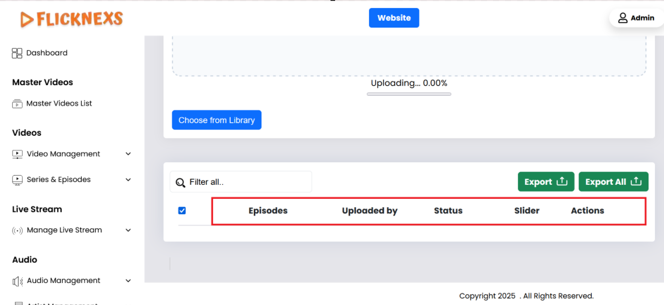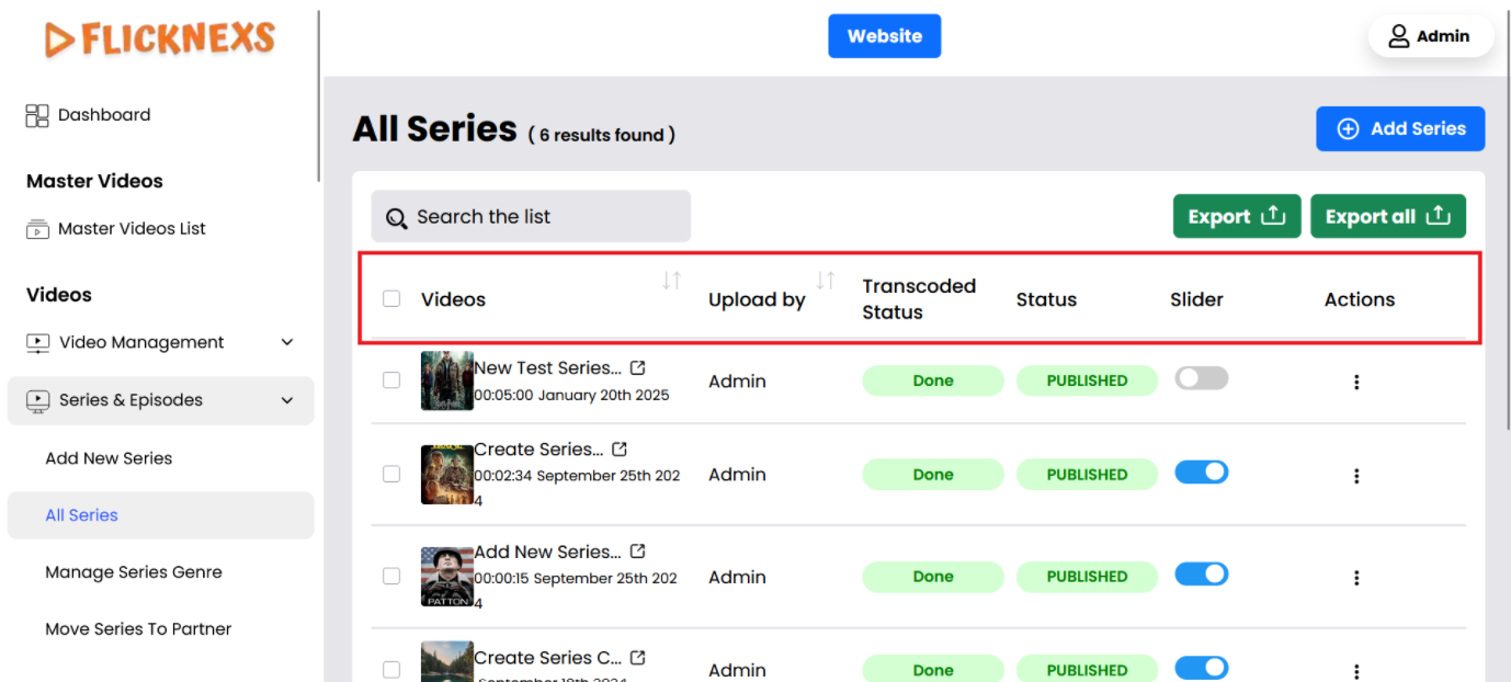 Within the Series & Episodes section, you’ll find the All Series subsection, which provides a comprehensive view of all the Series uploaded to the platform. Here’s a breakdown of what you can see and do in this section: