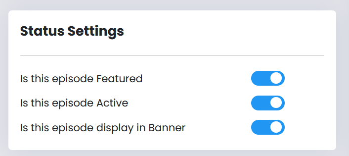 - Active/Inactive Toggle: This slider lets you control whether the episode is currently active and available to viewers. You can easily toggle the episode’s availability without deleting it from the system.