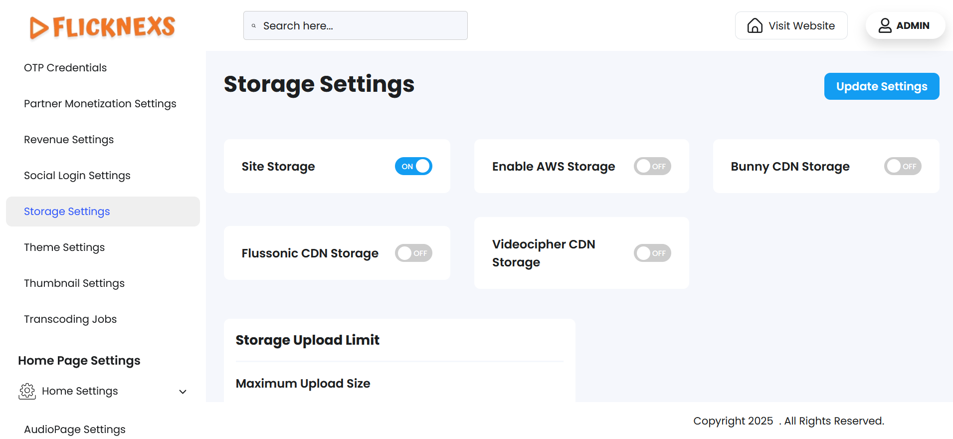 The Storage Settings section allows you to configure and manage where and how the media content on your platform is stored. This includes videos, images, audio files, and other media assets. You can choose between local storage (your server) or cloud storage services like Amazon S3, Flussonic CDN, Vdocipher, or Bunny CDN, depending on your platform’s requirements for scalability, reliability, and performance.