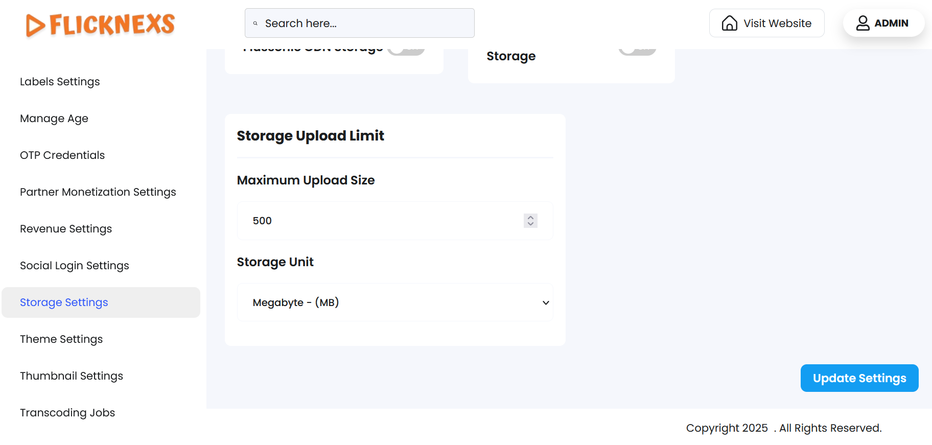 The Storage Upload Limit settings allow you to control the maximum file size that can be uploaded to your platform. This ensures efficient resource usage and helps prevent system overload or abuse by limiting unusually large uploads.