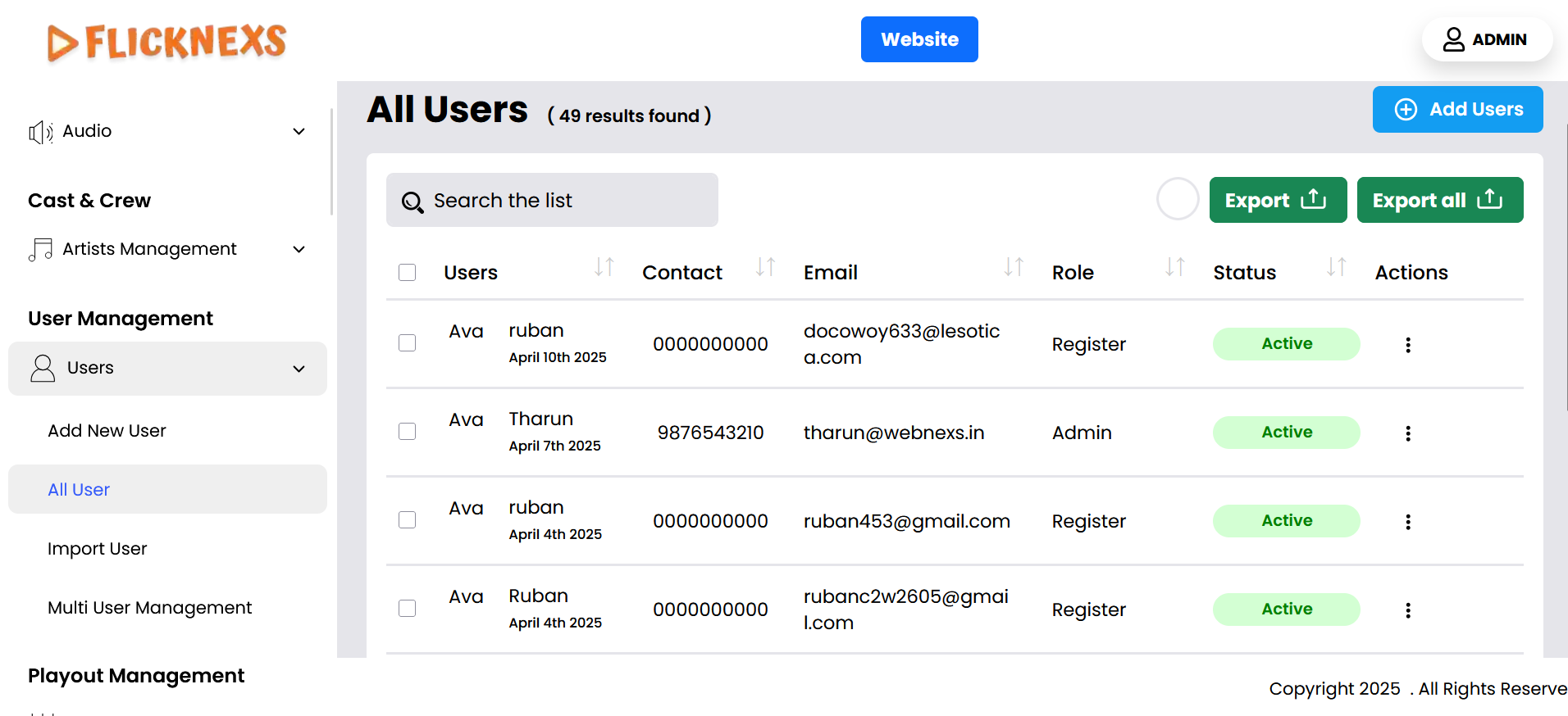 In the All Users section of your admin panel, you have the ability to view and manage a list of all registered users. Here’s a detailed explanation of each component you can see and the functionalities available: