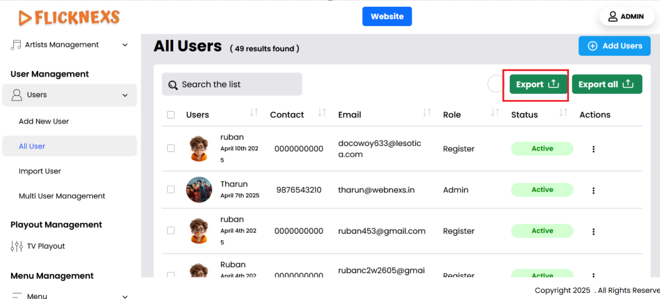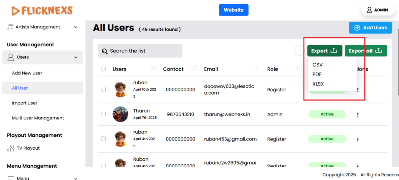 - You can download the user’s list by utilizing the export option available within the admin dashboard or user management section. This feature allows administrators to export data related to users, such as names, email addresses, registration dates, and other relevant details. The export process generates a CSV (Comma-Separated Values) file, which is a simple text format that organizes the user data in a structured, tabular form, PDF, and XLSX file.