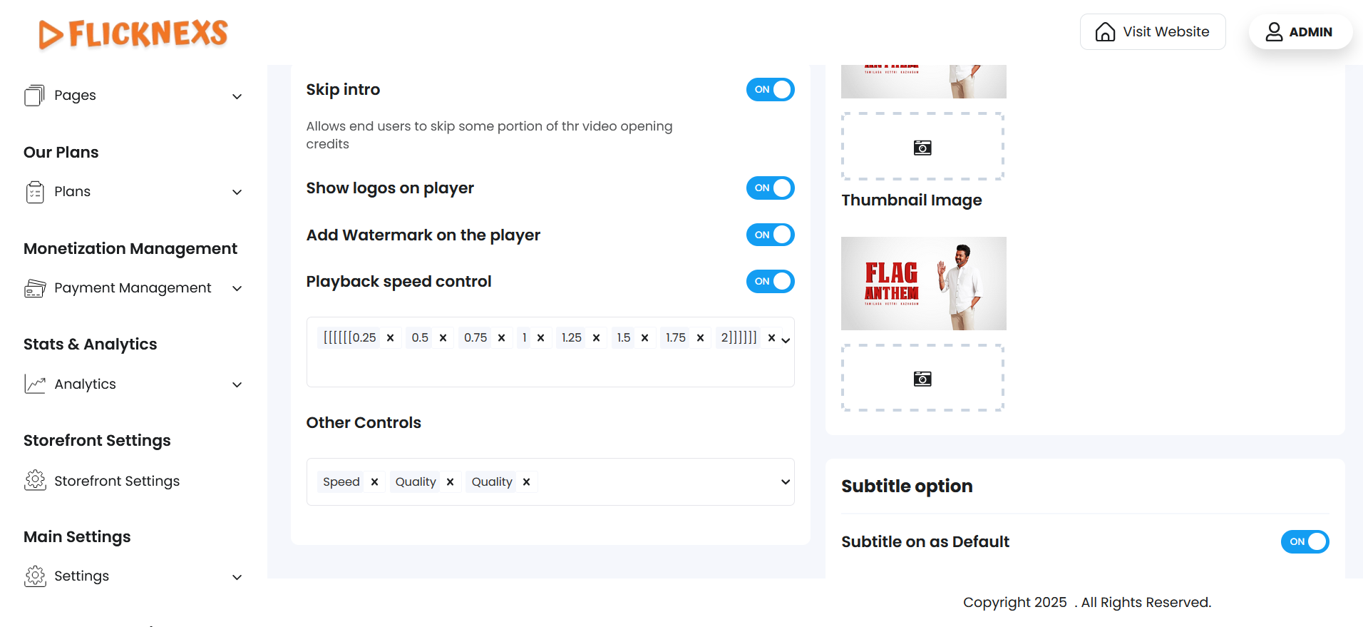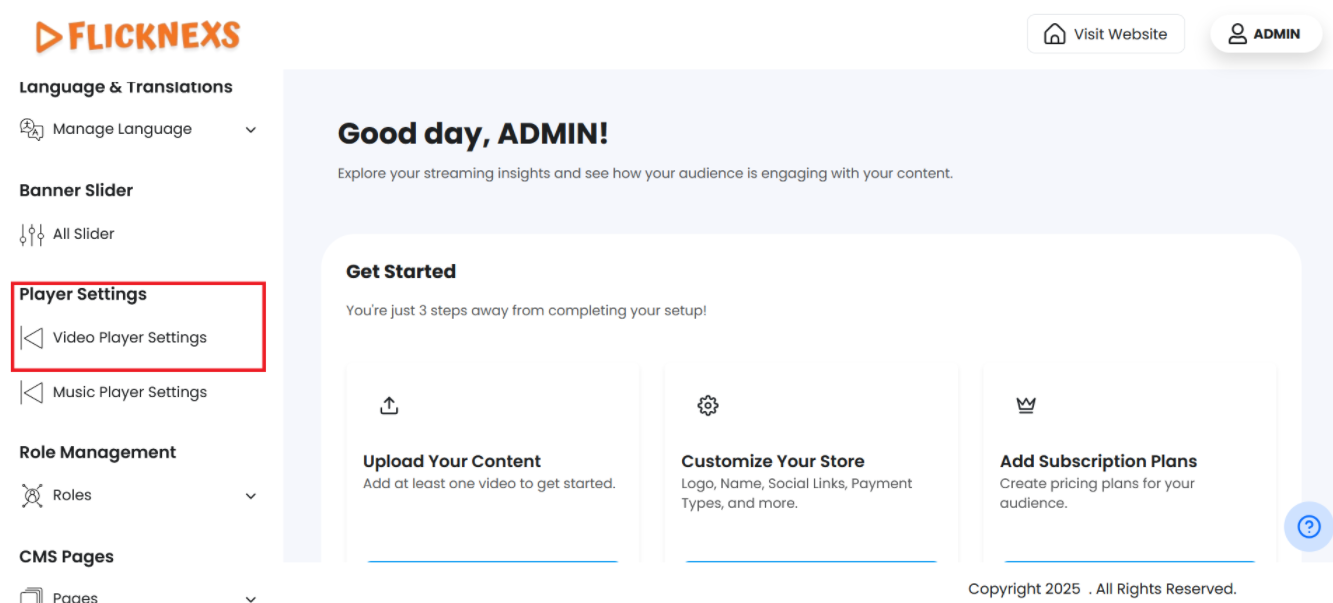 The Video Player Settings section allows administrators to configure and customize how video content is presented and played on the platform. These settings directly influence the viewer’s playback experience across web, mobile, and TV apps.